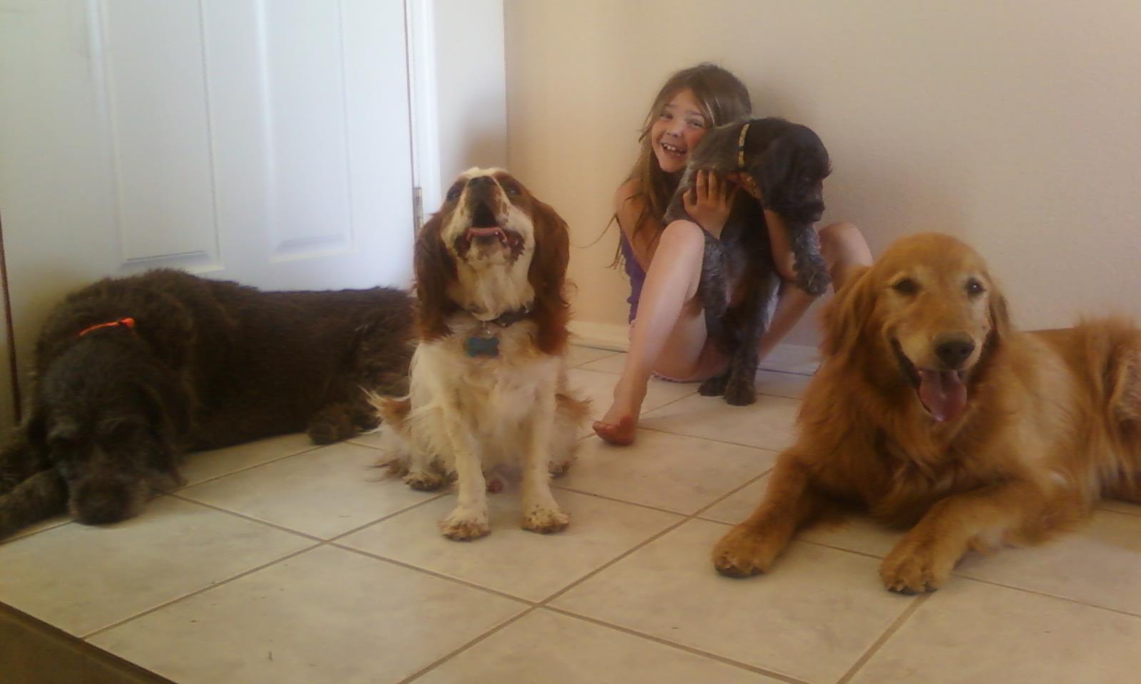 Basco, a fellow Wirehaired Pointing Griffon, Yogi the Cavalier King Charles Spaniel, Whiskey with Andrea, and Dewey the Golden Retriever