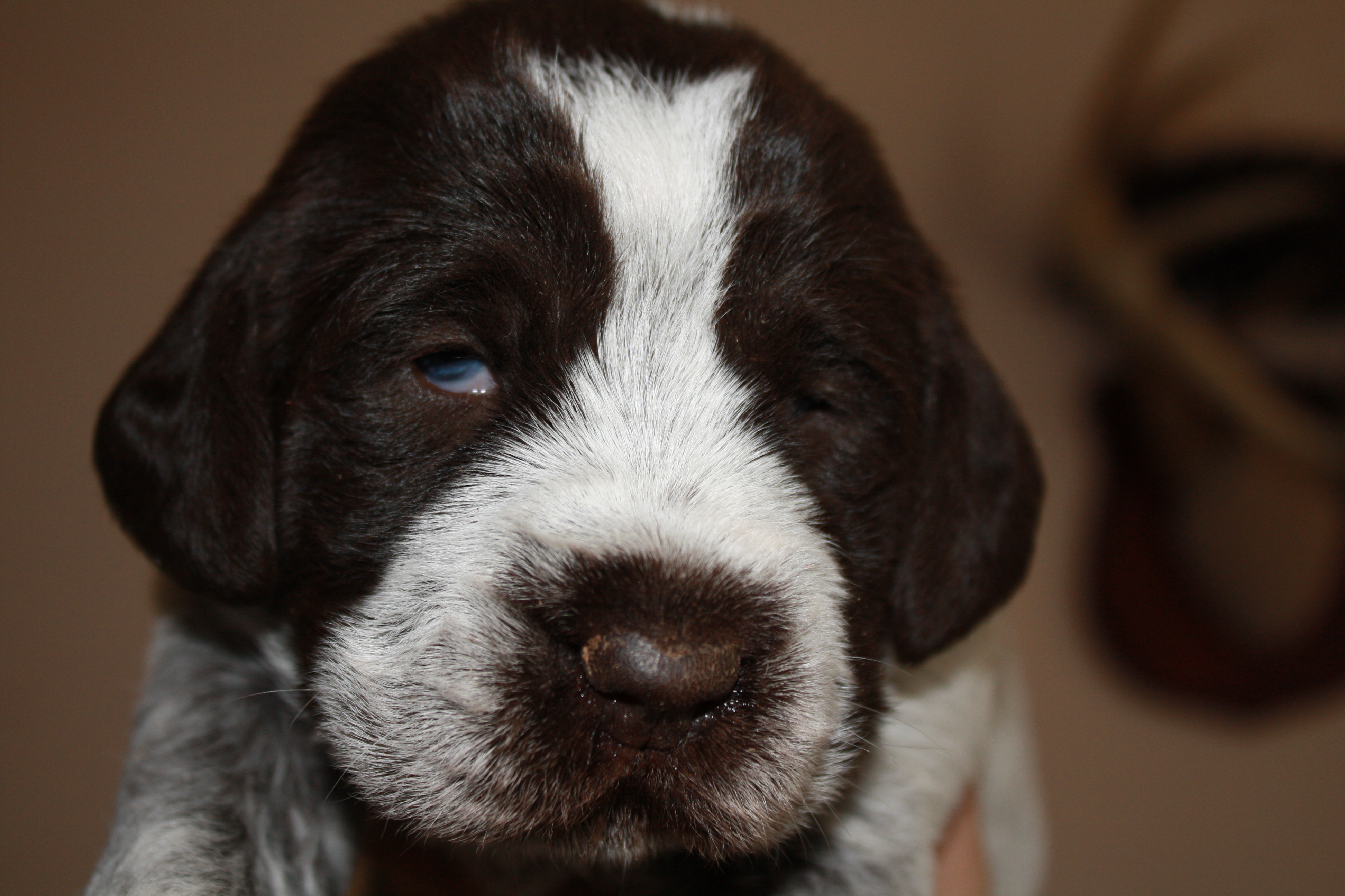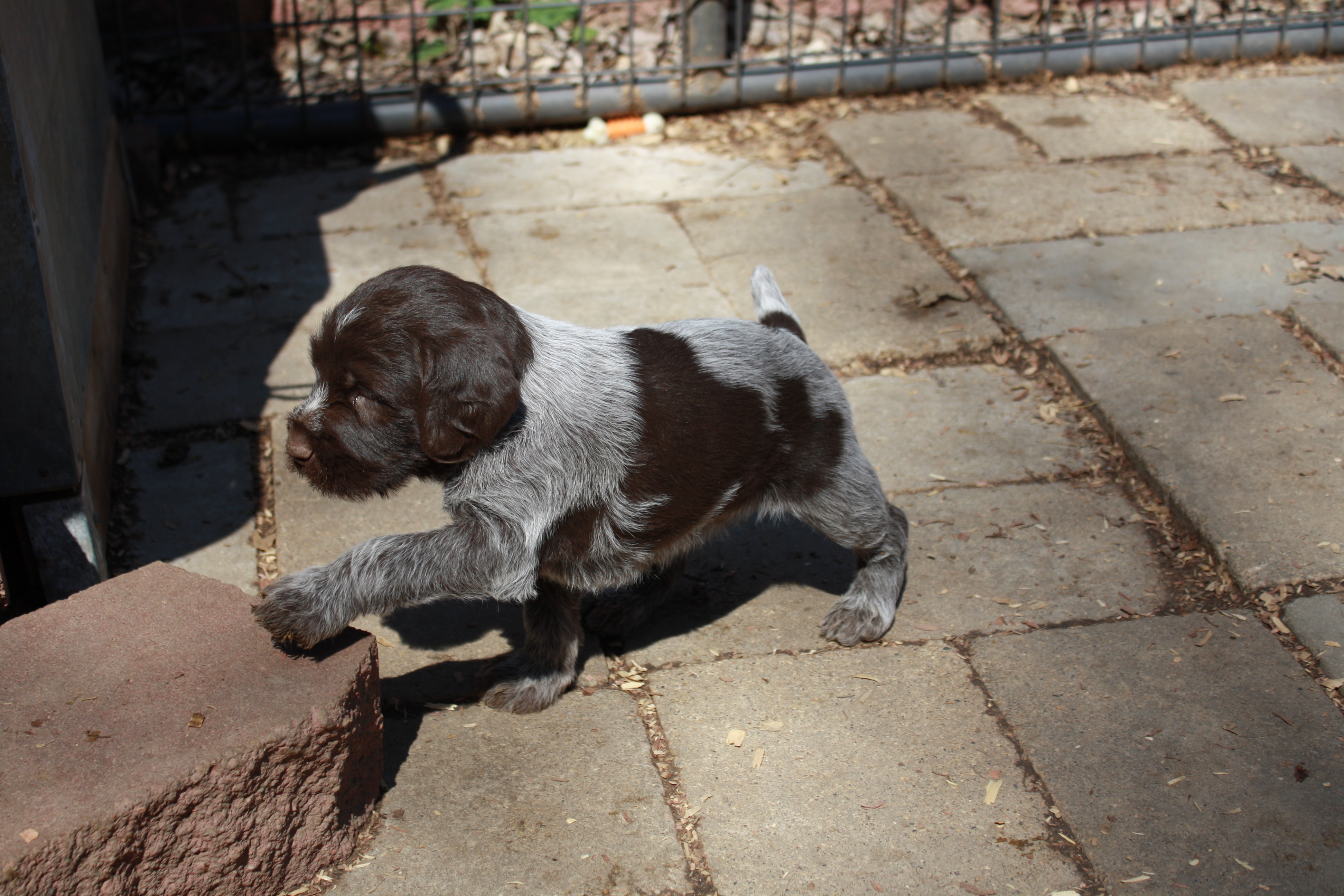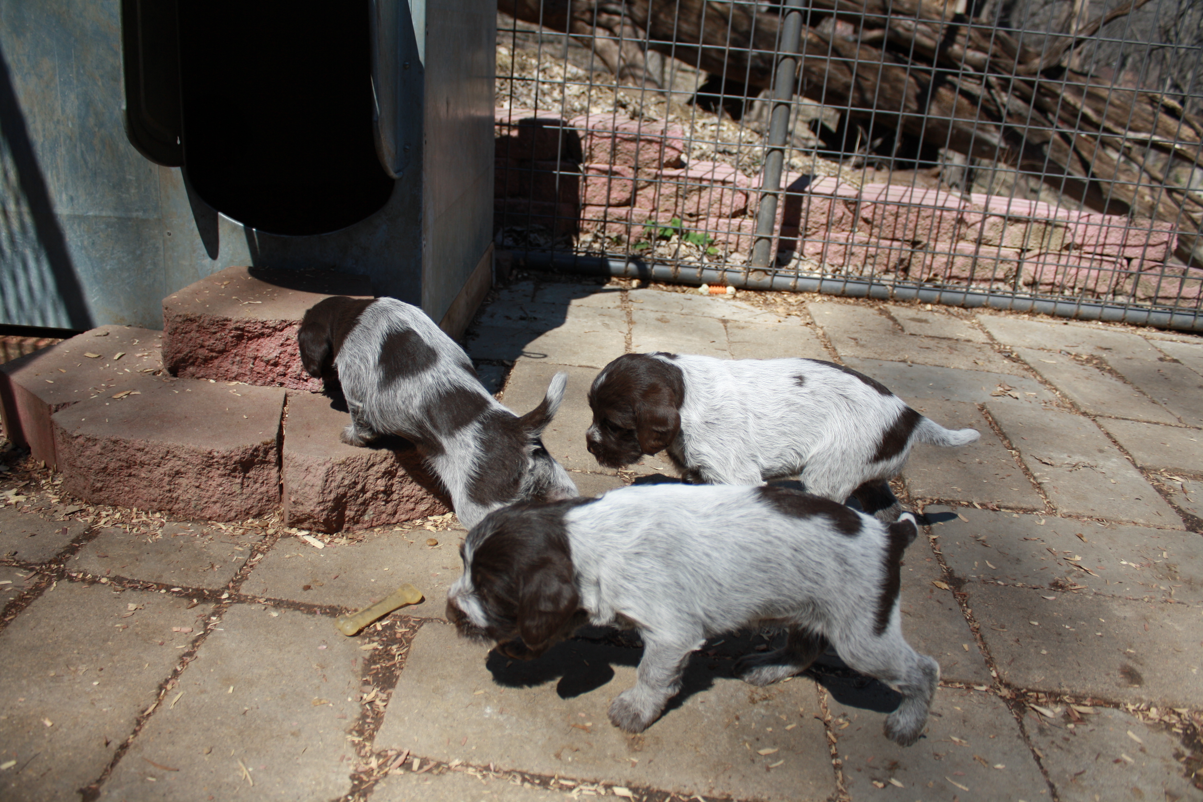 They are still hanging out in the whelping box, but it will soon be warm enough for them to move outside. Their eyes are open and they are moving around a little, but things should start picking up here within the next week. It will be time to start them on mush once they start moving around a bit more.