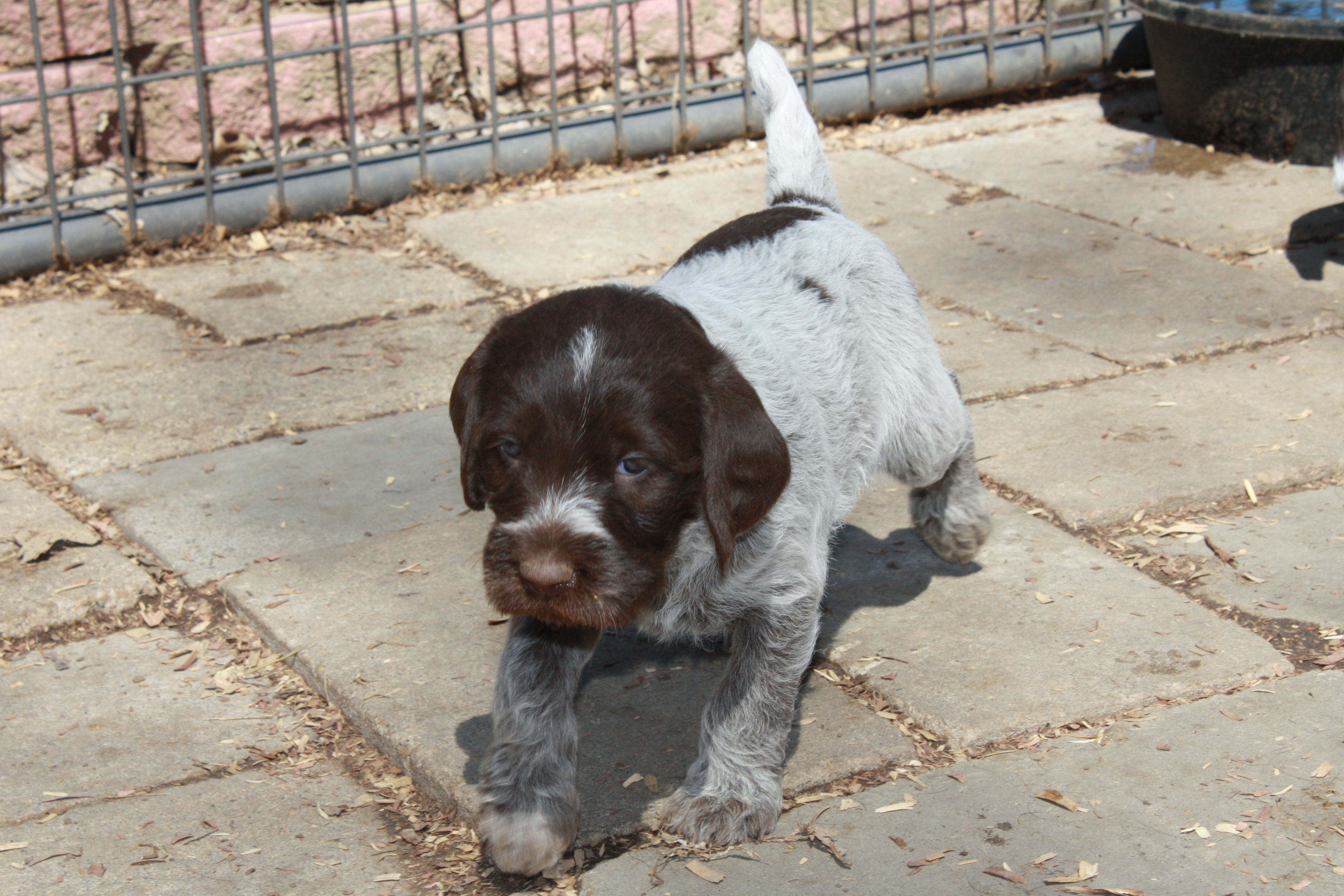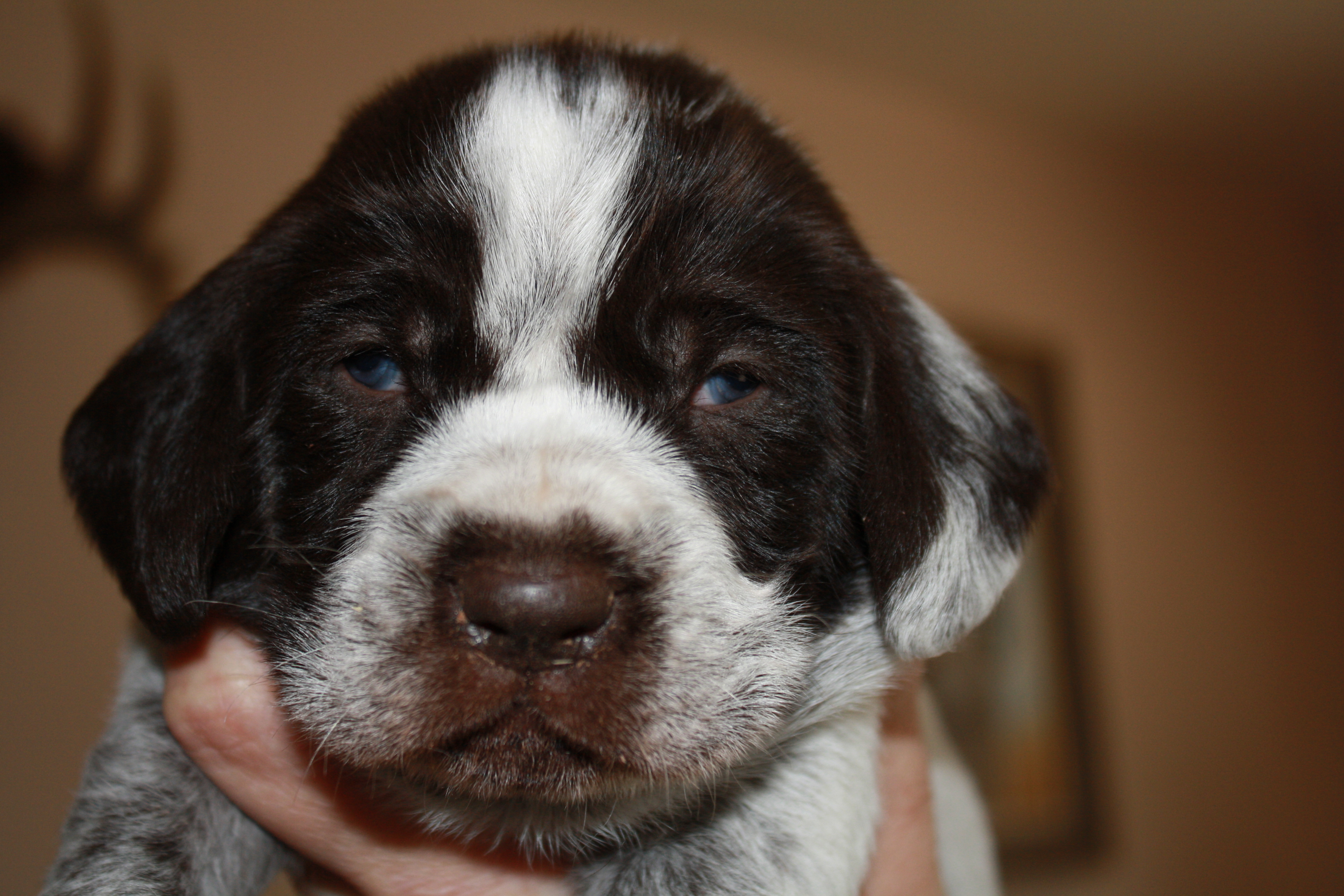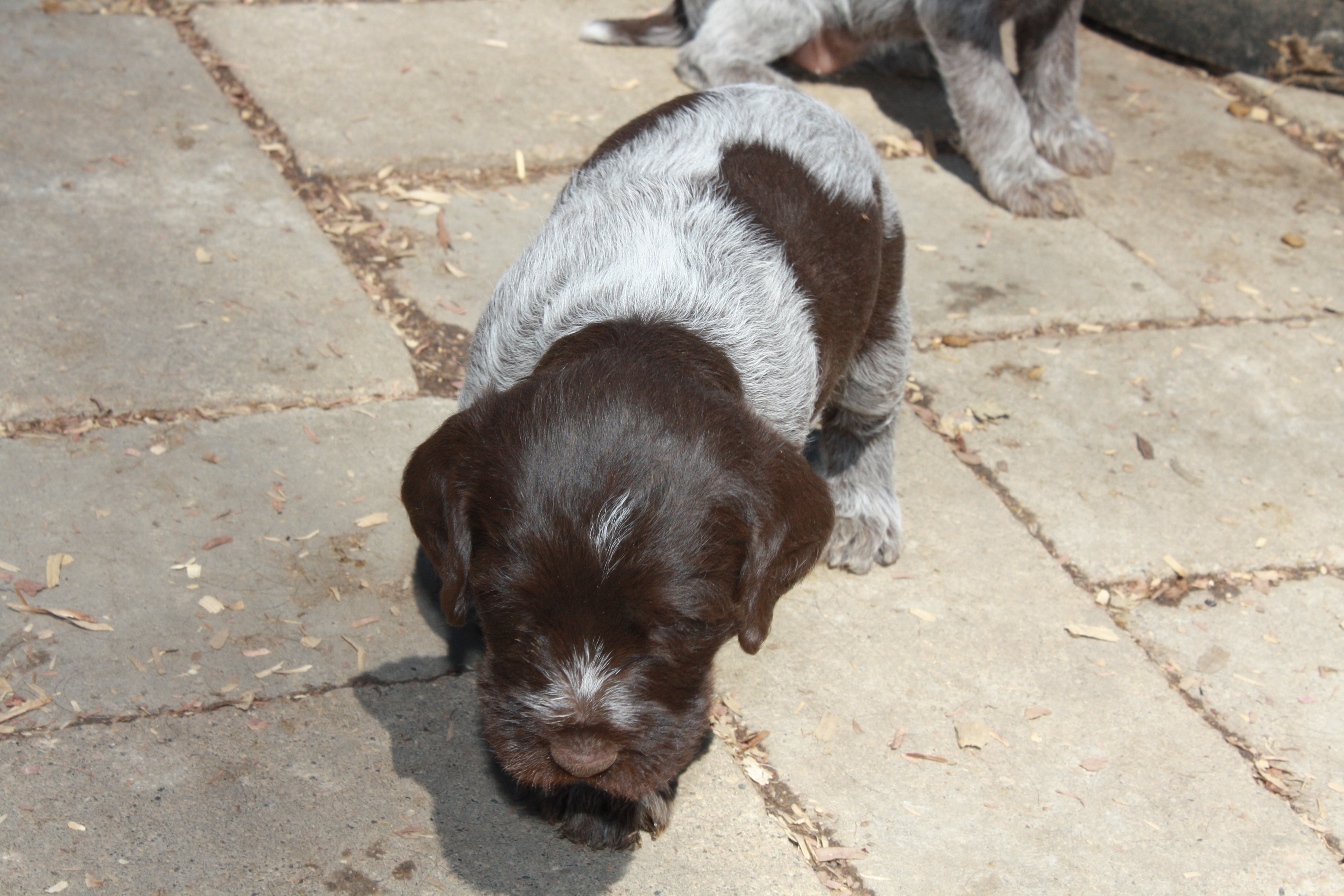 They are still hanging out in the whelping box, but it will soon be warm enough for them to move outside. Their eyes are open and they are moving around a little, but things should start picking up here within the next week. It will be time to start them on mush once they start moving around a bit more.
