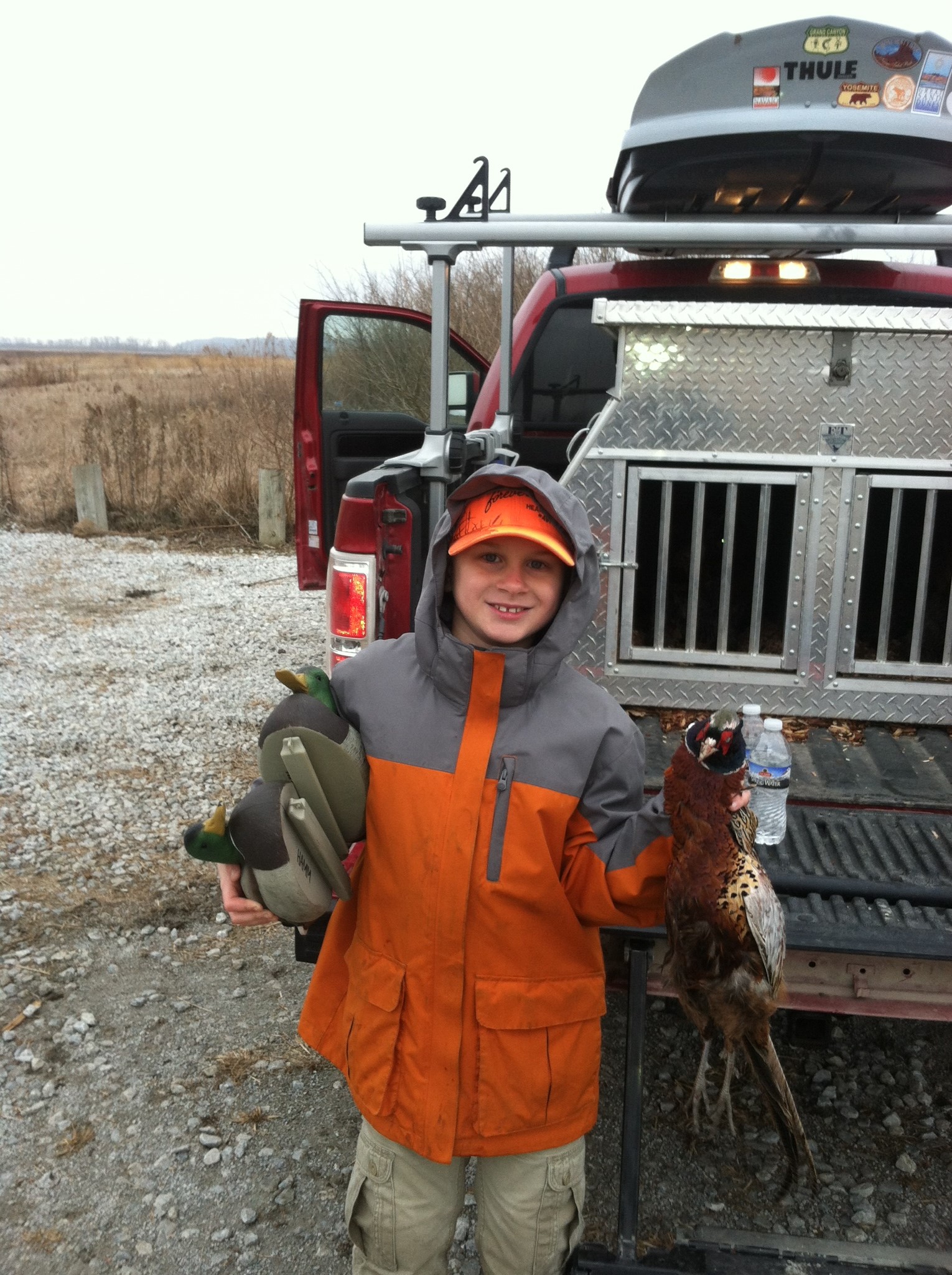 Charles, Matt, and Conrad went out Sunday for a little bit with Fire and Sam. It was Fire’s first time out after her accident and she did just fine. Here’s a picture of Conrad and the rooster, along with some duck decoys that they found.