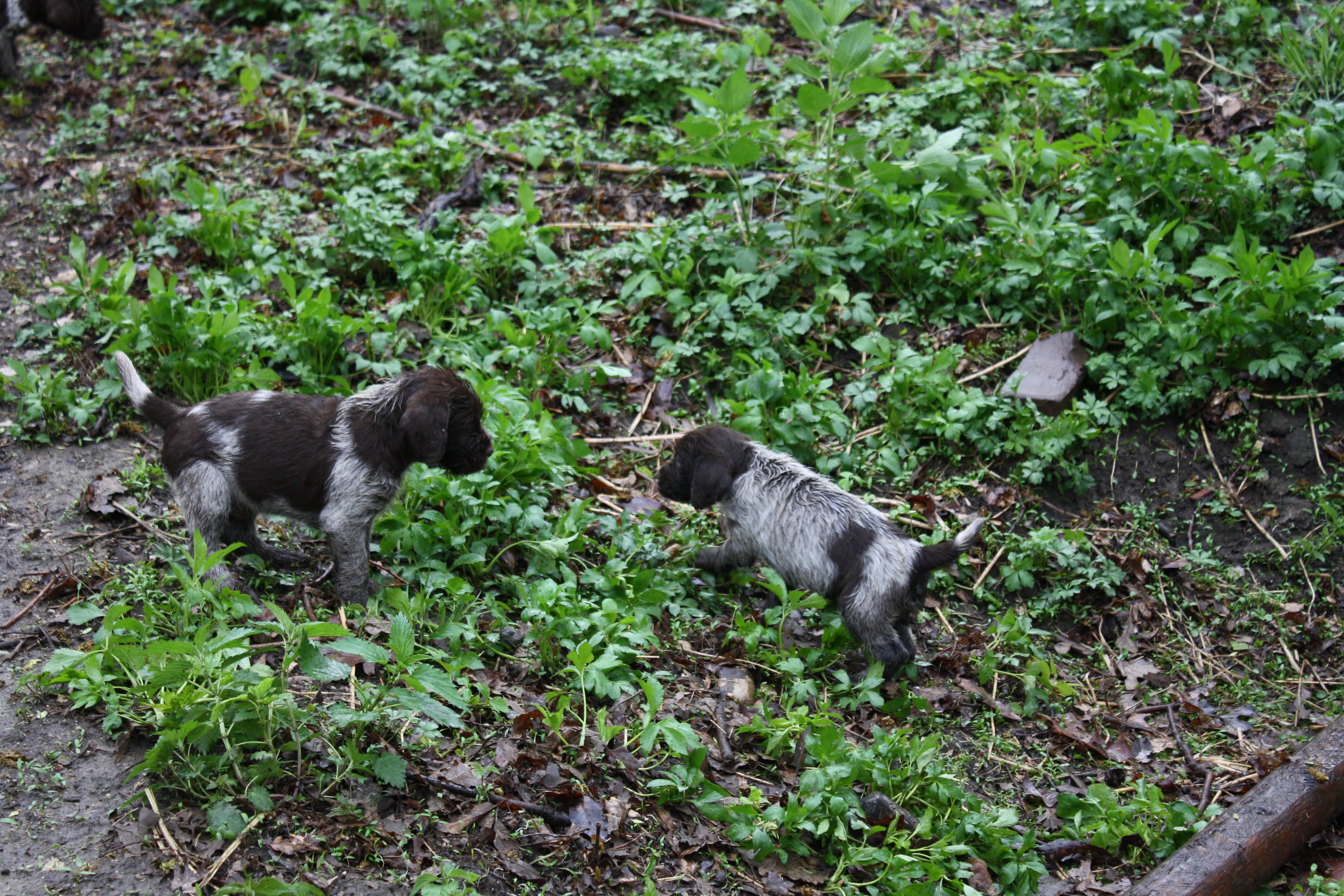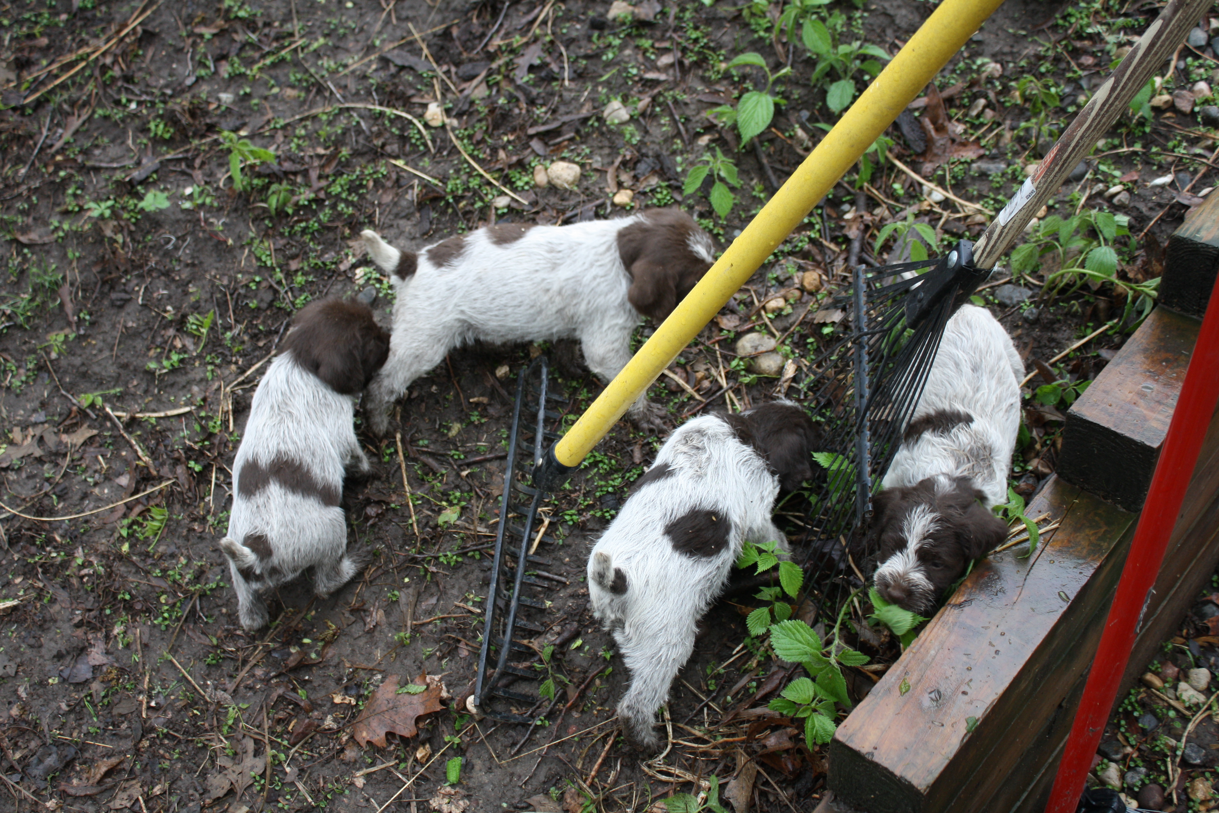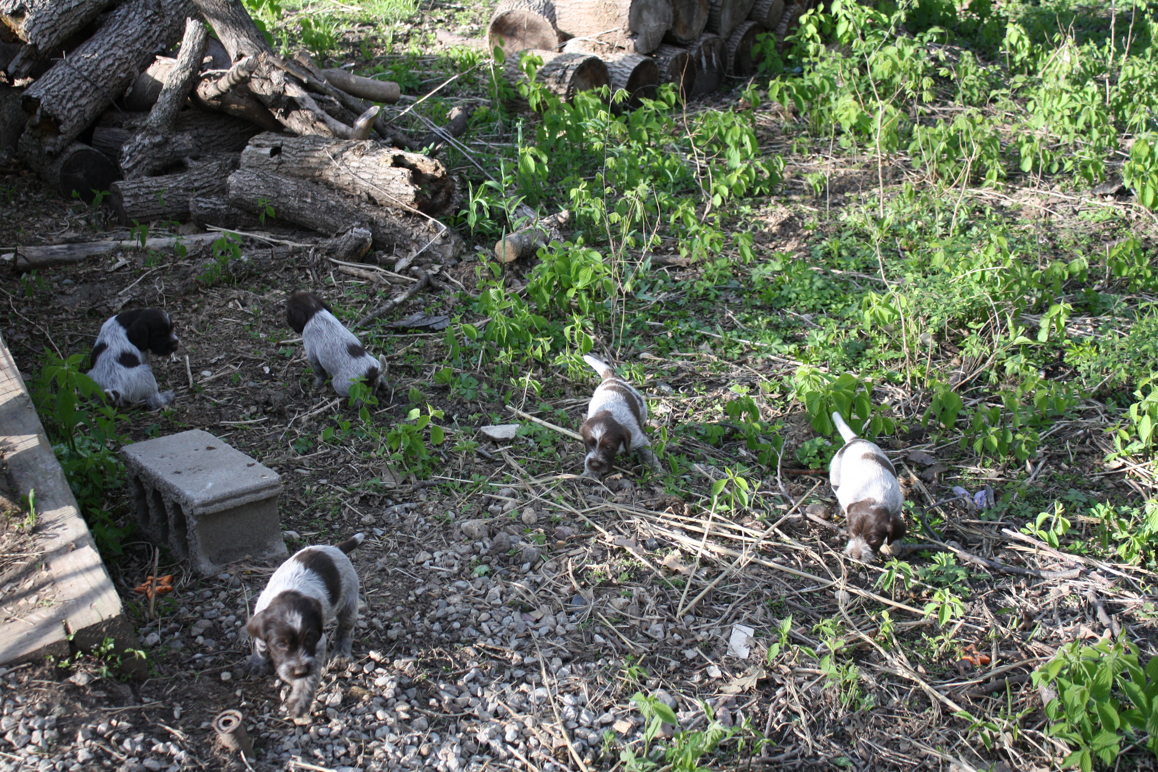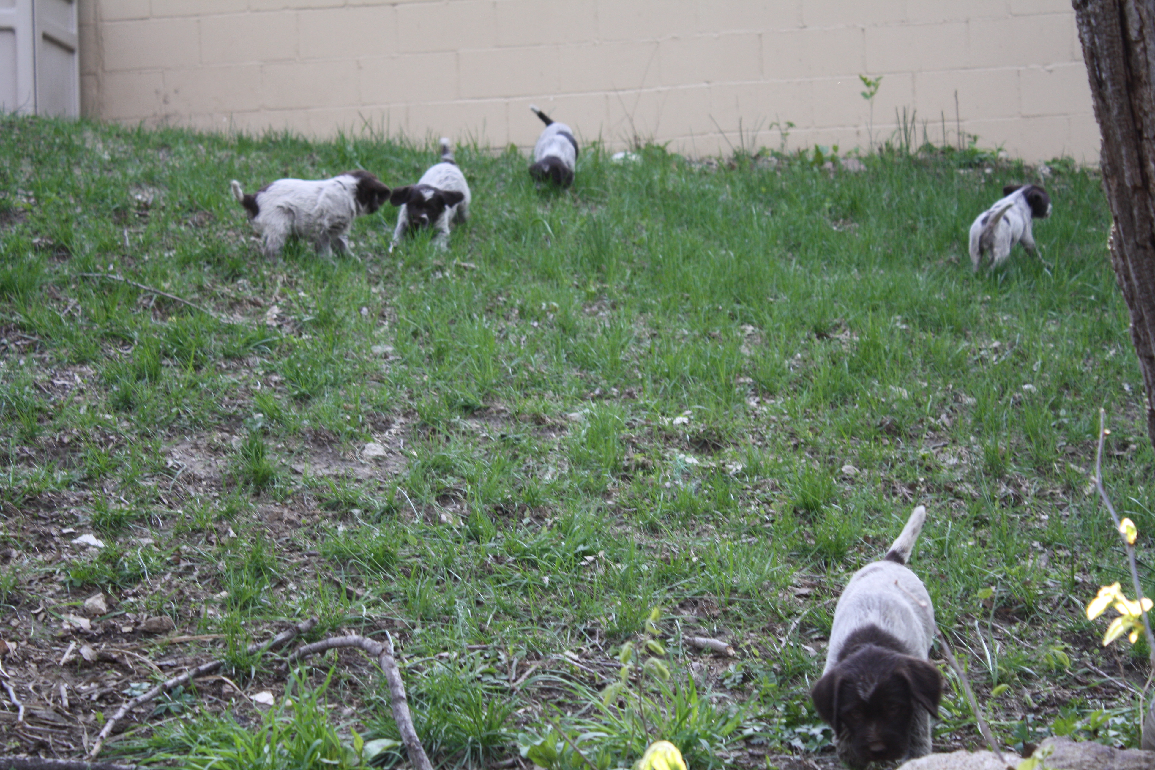 I moved the puppies outside two weeks ago on Friday and they immediately took to being in the outdoor kennel with the fresh air and sunshine. Being inside is okay, but it just doesn’t provide the stimulation that birds and squirrels and the ever-changing weather provides. The first week they did not venture out of the kennel, but now they are on full-blown play-in-the-woods mode.