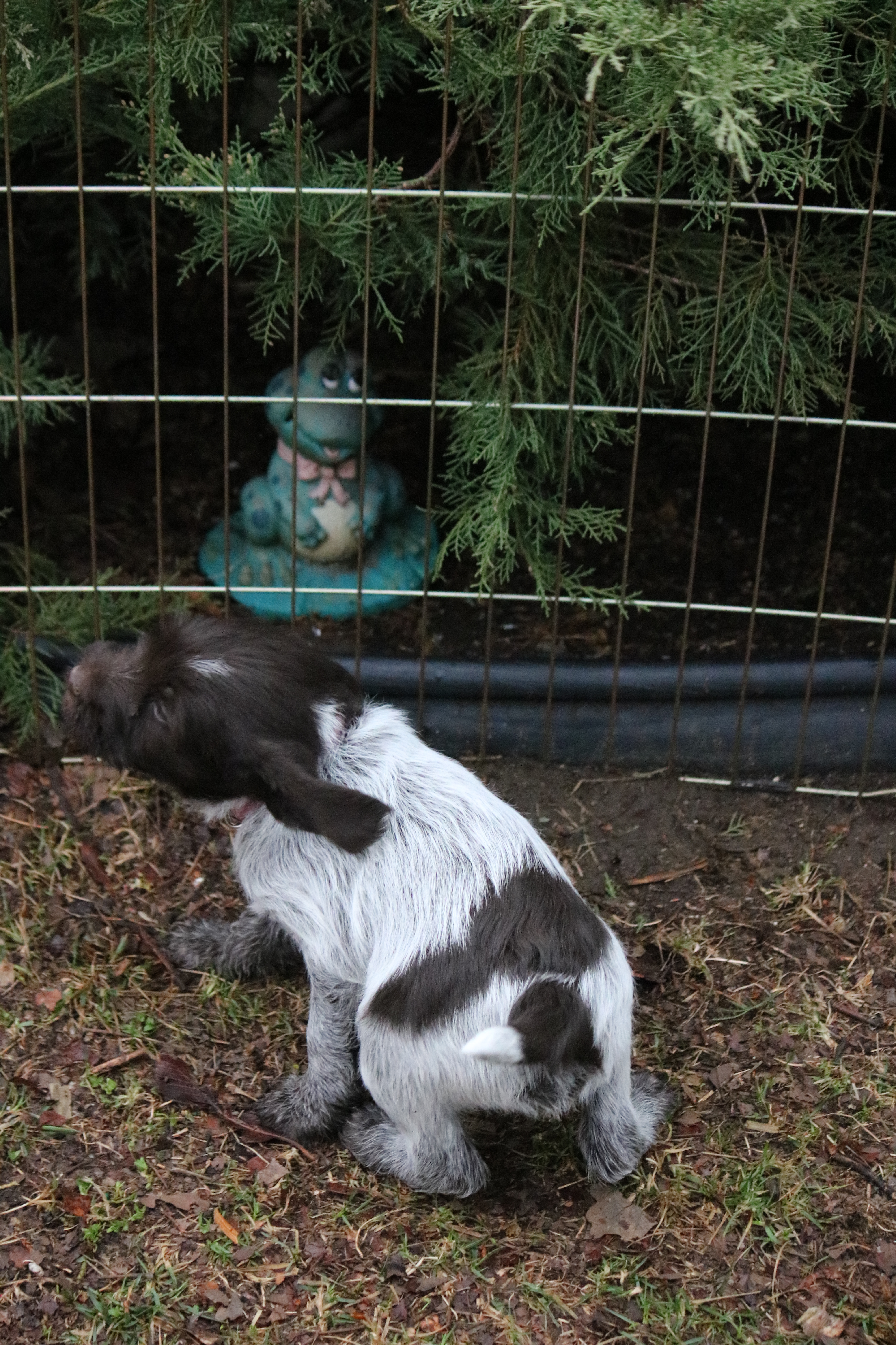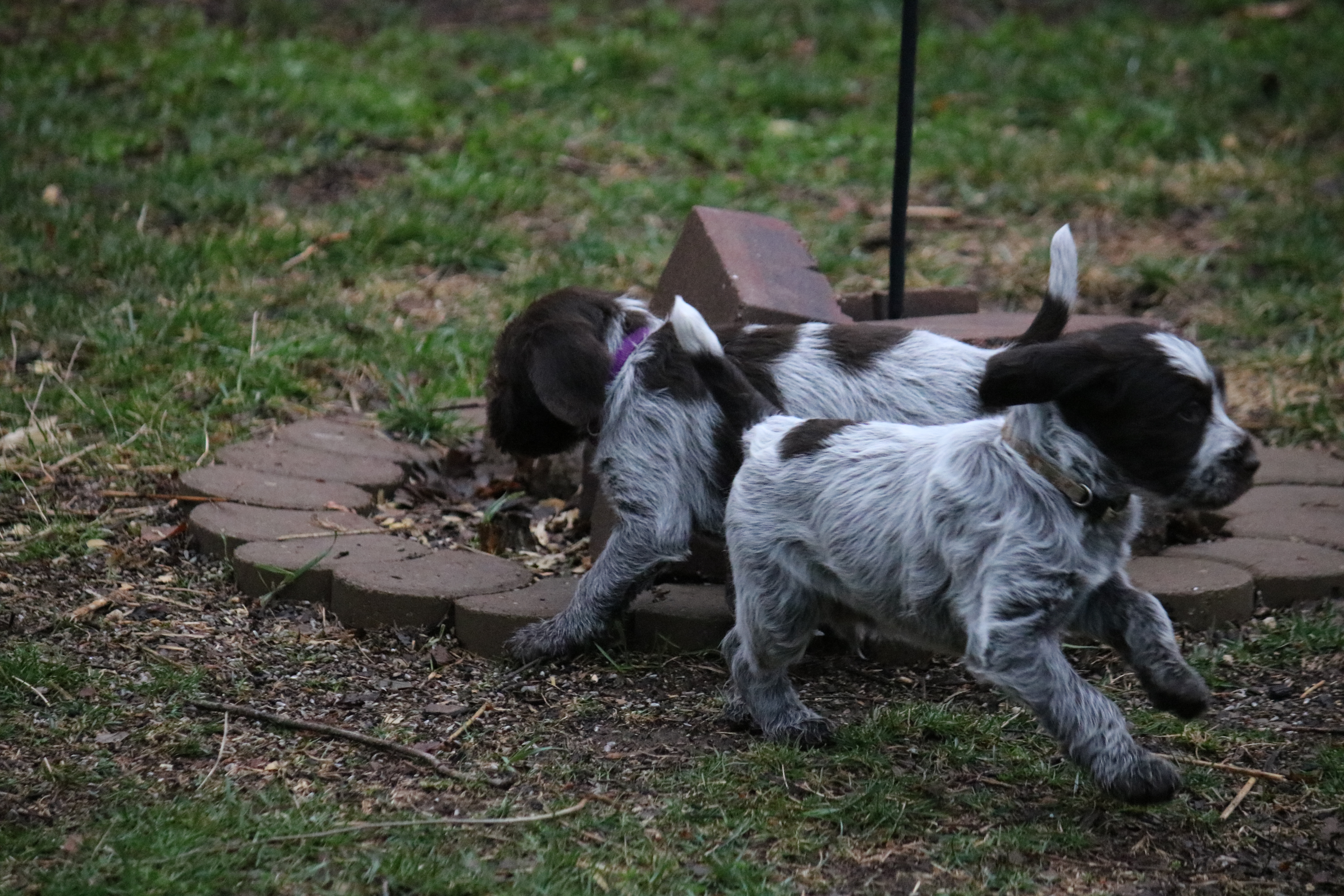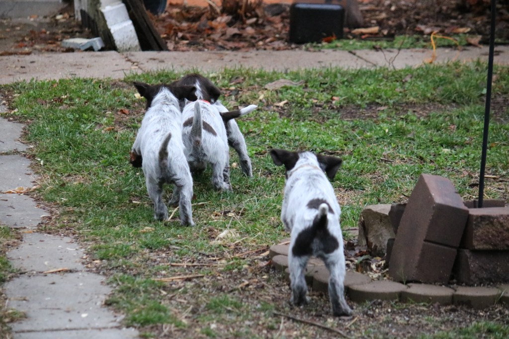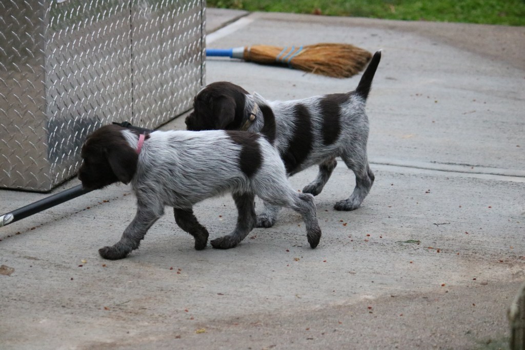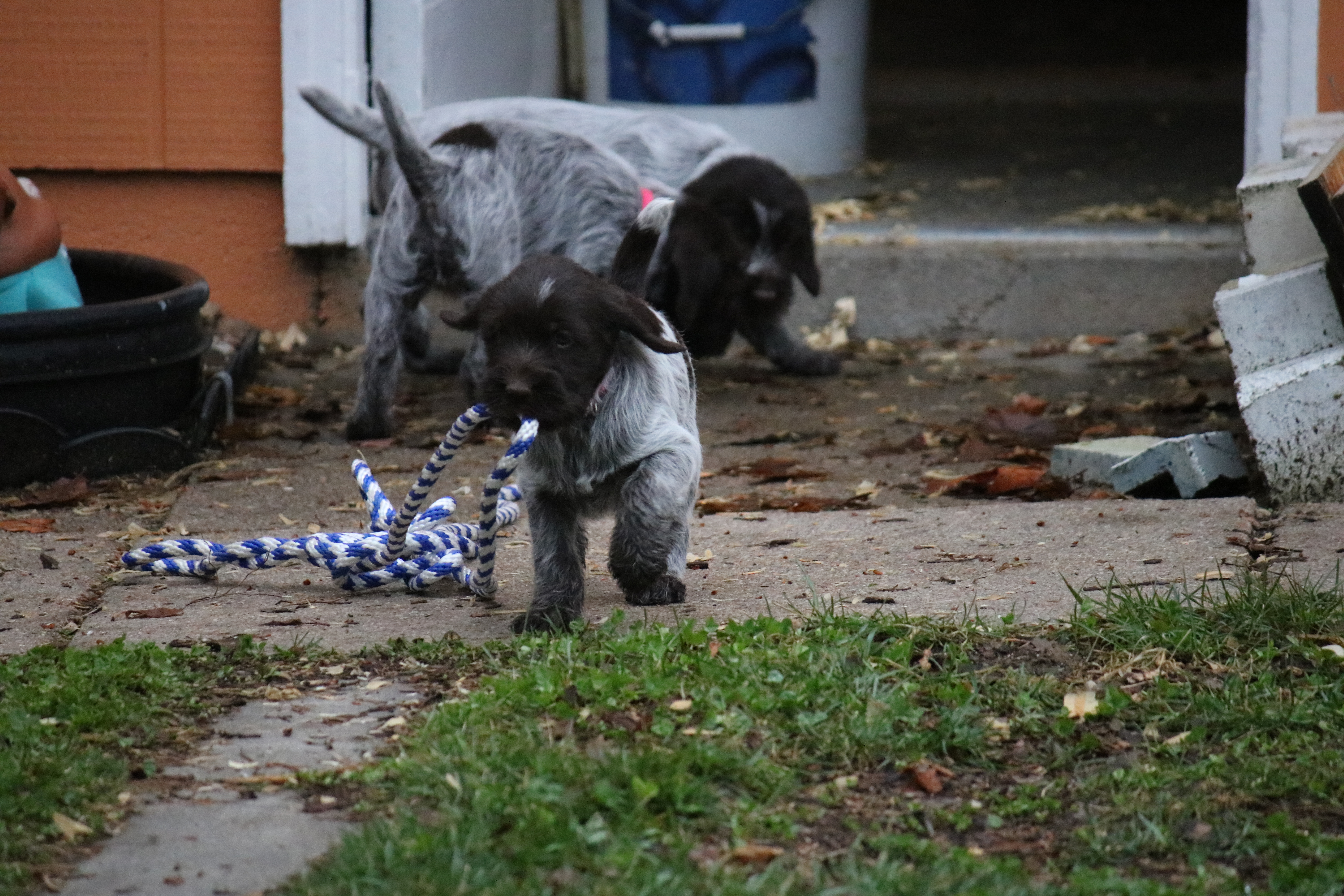 These puppies are ready for action. We are going out in the yard around three times a day and if it is raining I have the garage picked up enough for them to run around. This is a big week for the puppies since they are going to be de-wormed for the first time, also introduced to the pigeon coop and a dead quail. It is always fun. Oh and I want to get them started on crate conditioning. It is not full-on crate training, but just the opportunity to spend time in a crate so that it isn’t a totally unfamiliar experience. They already prefer to potty outside, so hopefully having the new owners housebreak them once they are in their new homes won’t be awful, although Griffs are notoriously long to housebreak.