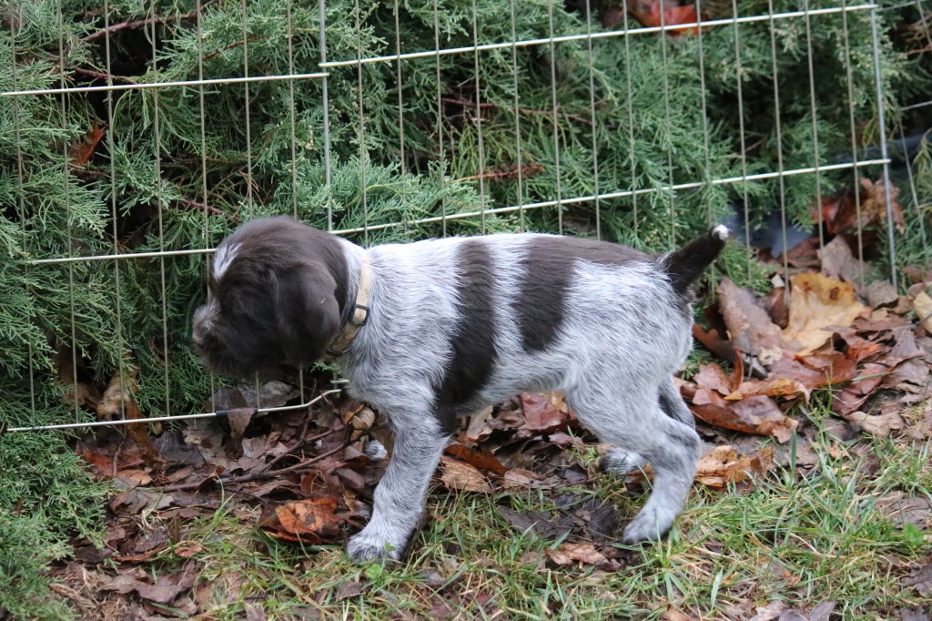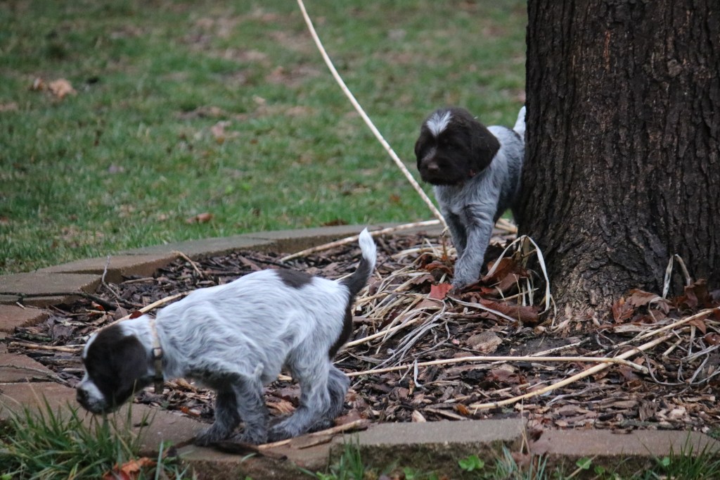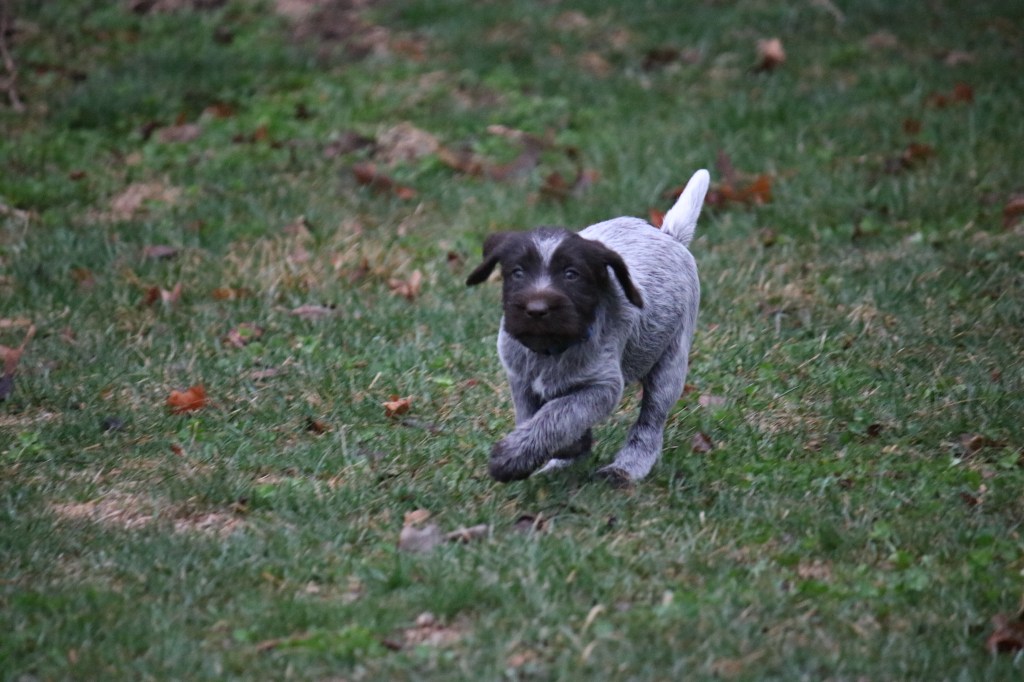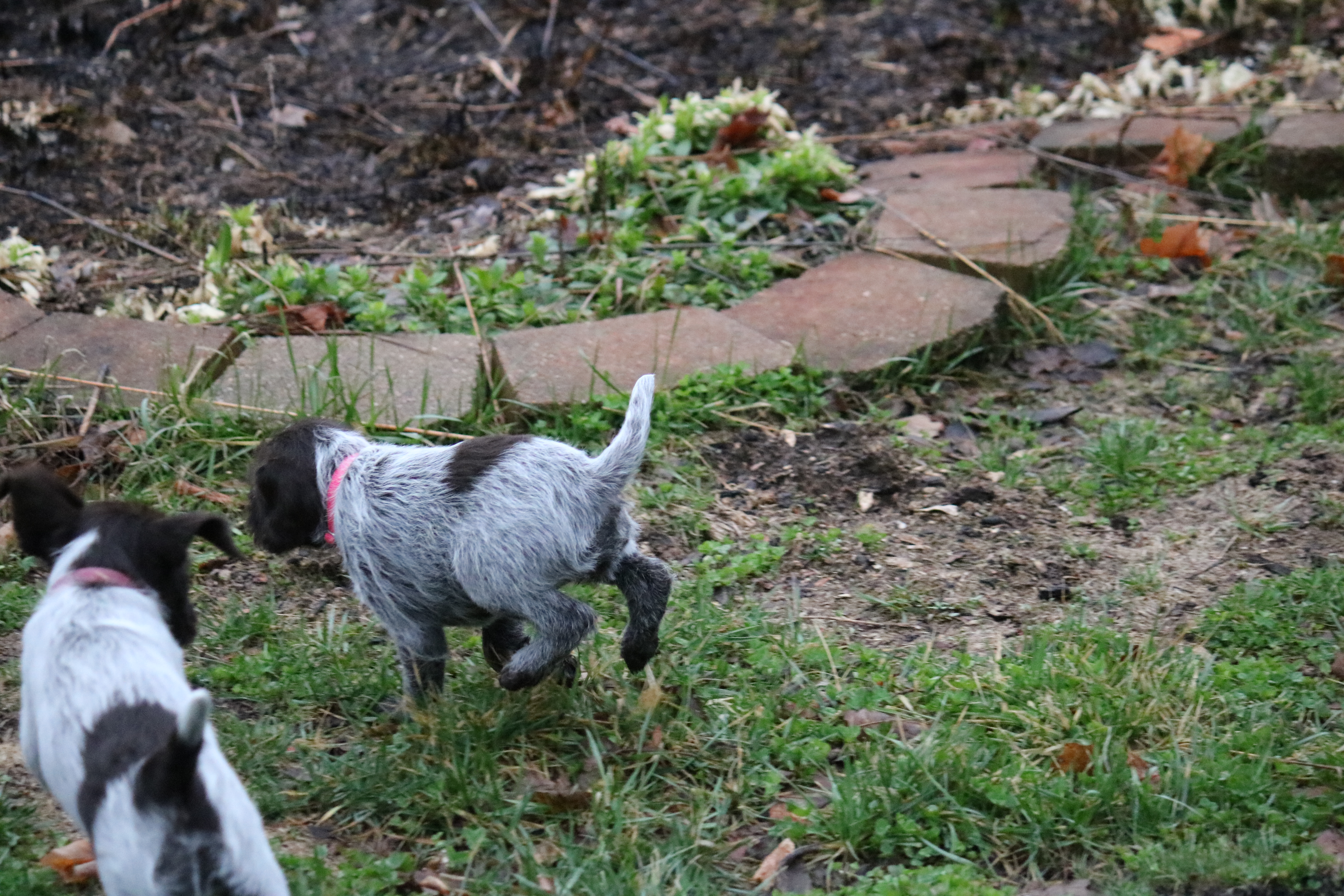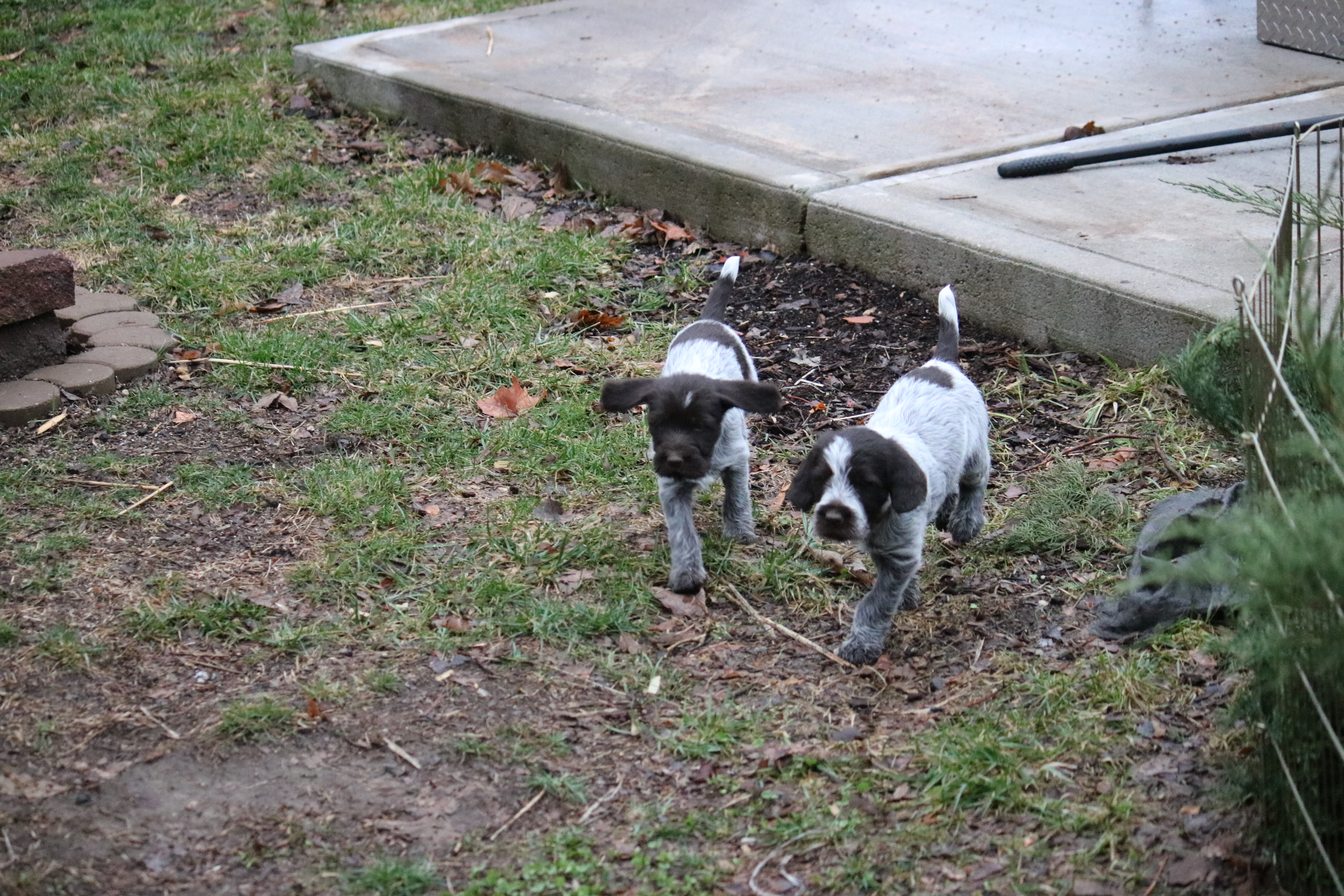 These puppies are ready for action. We are going out in the yard around three times a day and if it is raining I have the garage picked up enough for them to run around. This is a big week for the puppies since they are going to be de-wormed for the first time, also introduced to the pigeon coop and a dead quail. It is always fun. Oh and I want to get them started on crate conditioning. It is not full-on crate training, but just the opportunity to spend time in a crate so that it isn’t a totally unfamiliar experience. They already prefer to potty outside, so hopefully having the new owners housebreak them once they are in their new homes won’t be awful, although Griffs are notoriously long to housebreak.