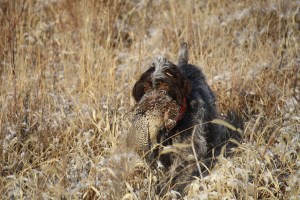 Sue was our very first Wirehaired Pointing Griffon, purchased out a one-time breeding in northwestern Nebraska. Sue’s greatest gift is her strong natural retrieve, not only bringing you downed game birds, but she always has to be bringing you something. If there’s dirty laundry on the floor, she will pick it up and bring it to you. Sue, like all of our griffs, is extremely loving and attentive. She’s spent many years traveling the Great Plains in search of game birds and a number of seasons as a guide dog on a local pheasant preserve.
