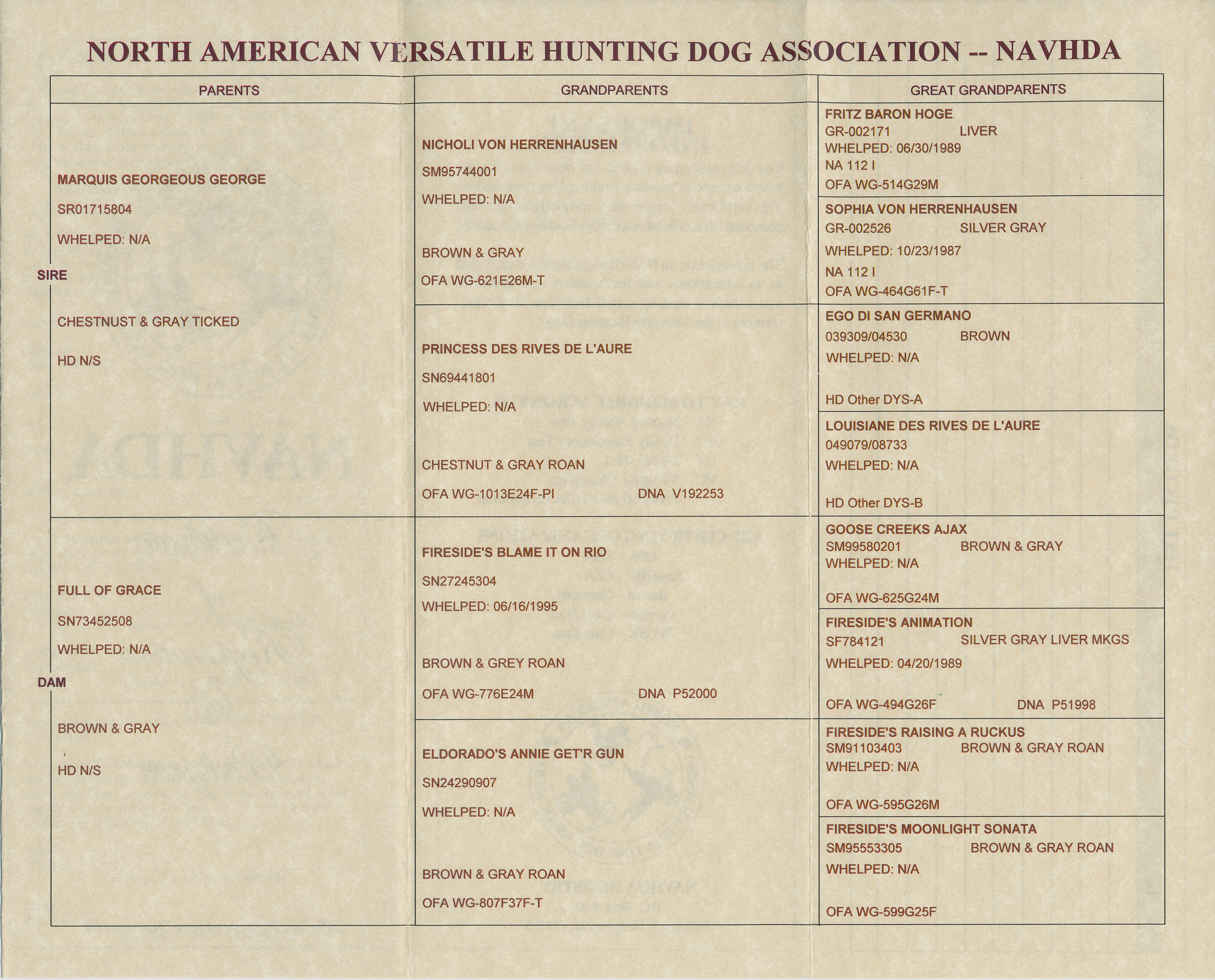 Coat Color: Liver and Gray Roan (very liver with little gray)