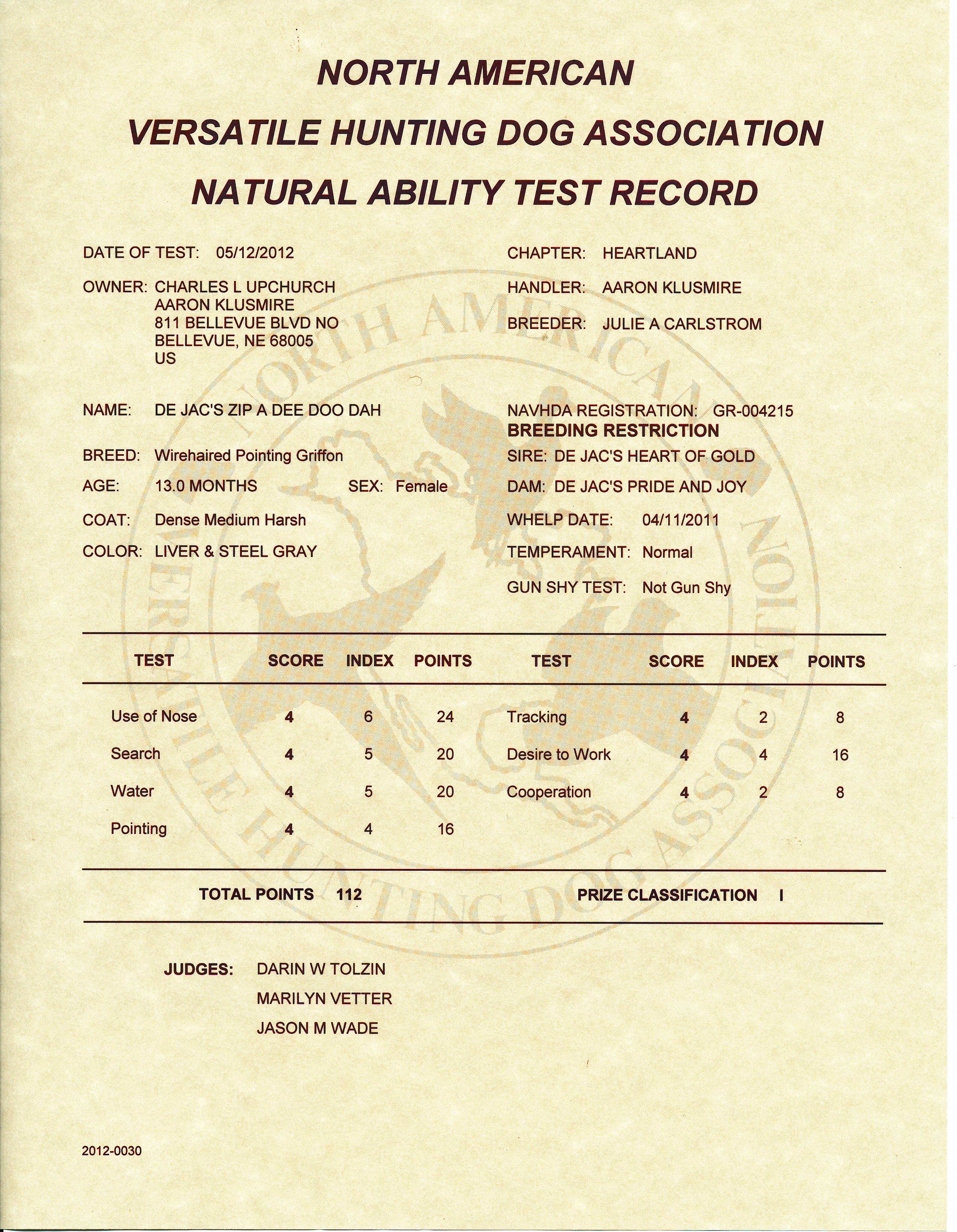 NAVHDA Natural Ability Prize I, Score 112 (Maximum Score)