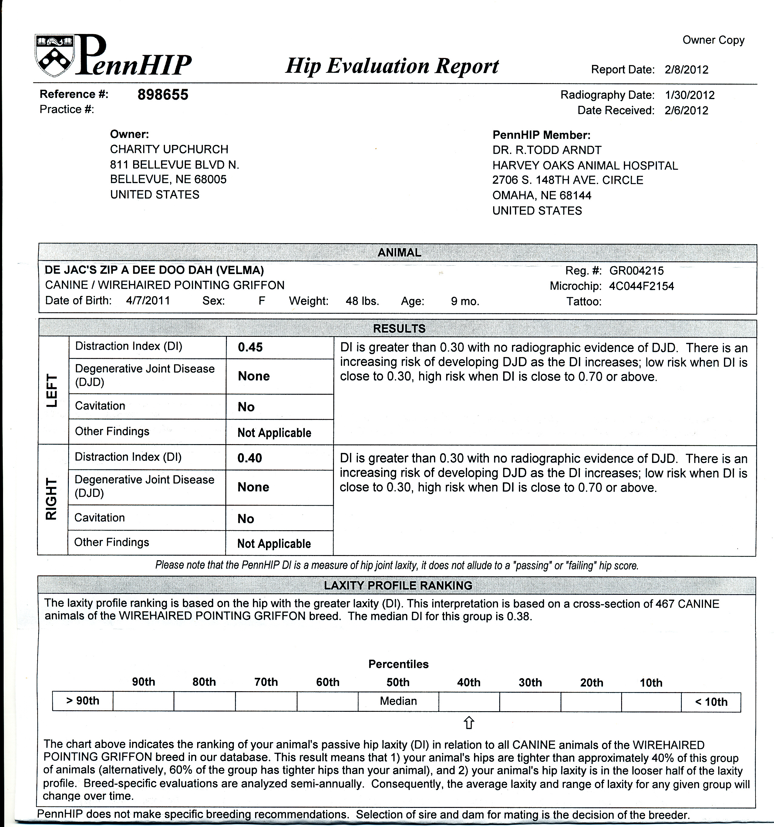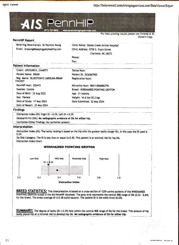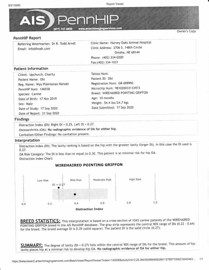 PennHIP: .29 DI Left, .29 DI Right, Minimal Risk for OA, Excellent for the breed.