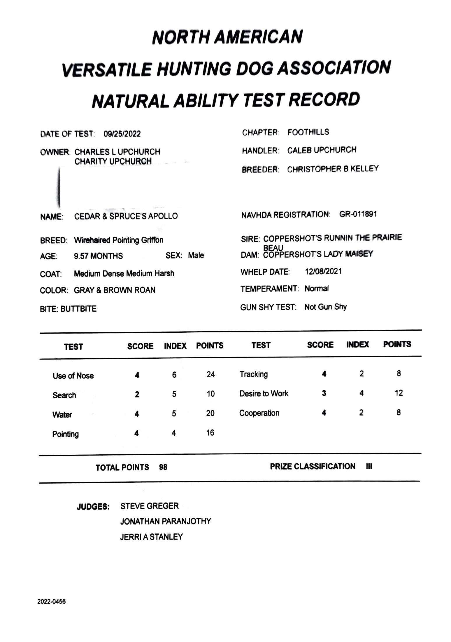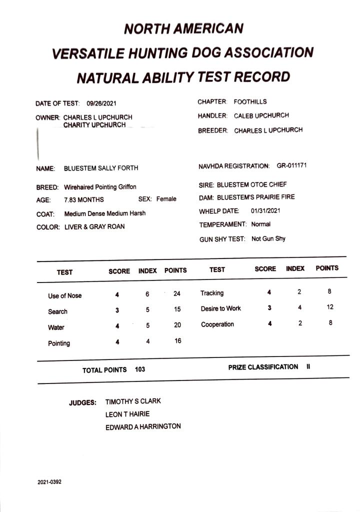 Hunt Testing: NAVHDA Natural Ability Prize I with a maximum score of 112 points