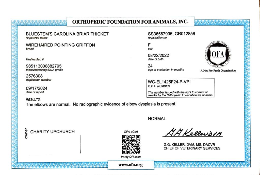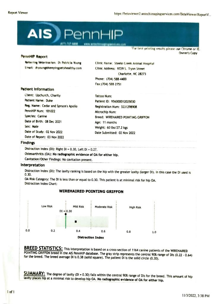 Hips: PennHIP Right DI=.3 Left DI .27, low risk for dysplasia and in the top 20% of the breed.