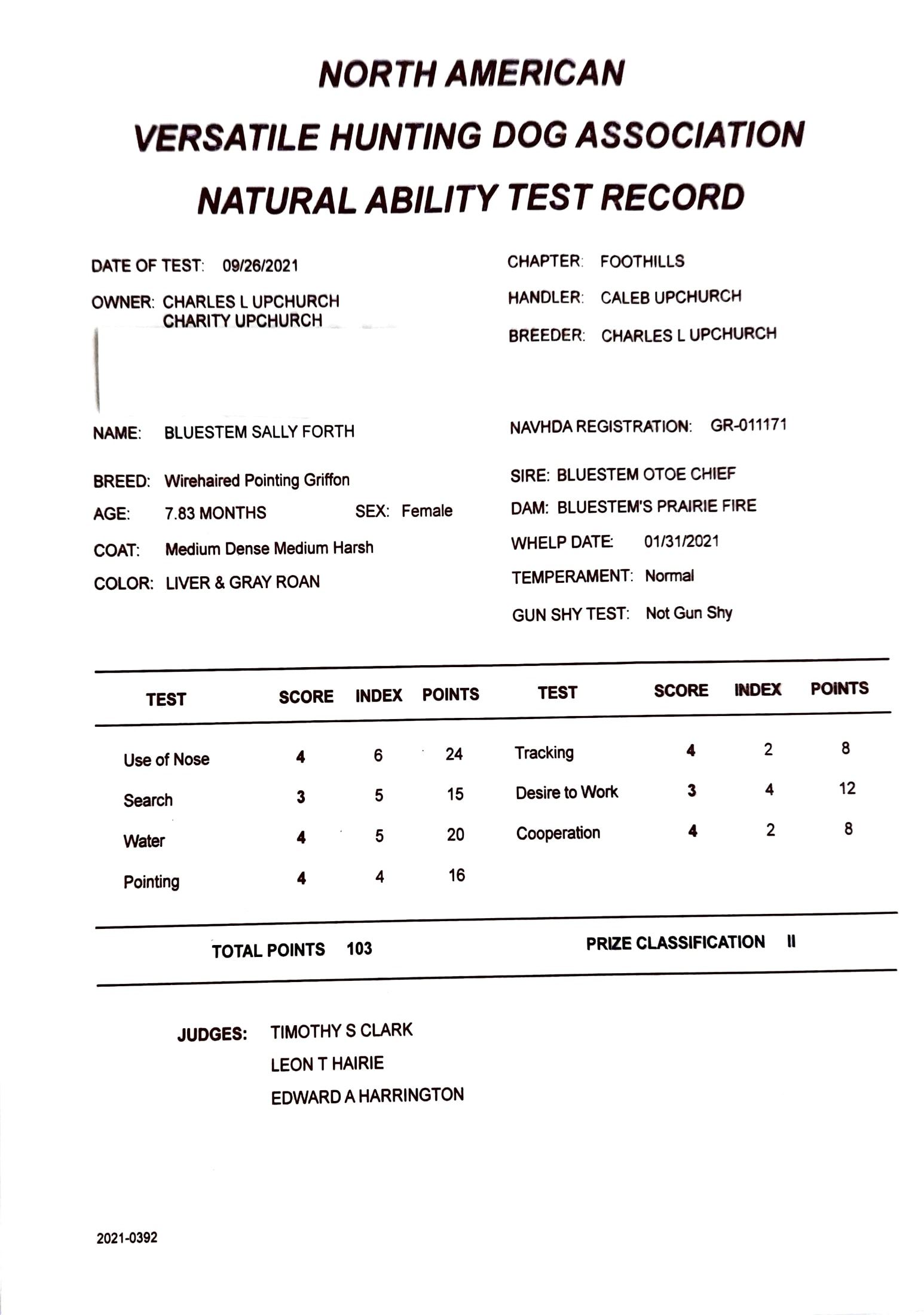 NAVHDA Natural Ability Prize II, score 103 with a Junior Handler