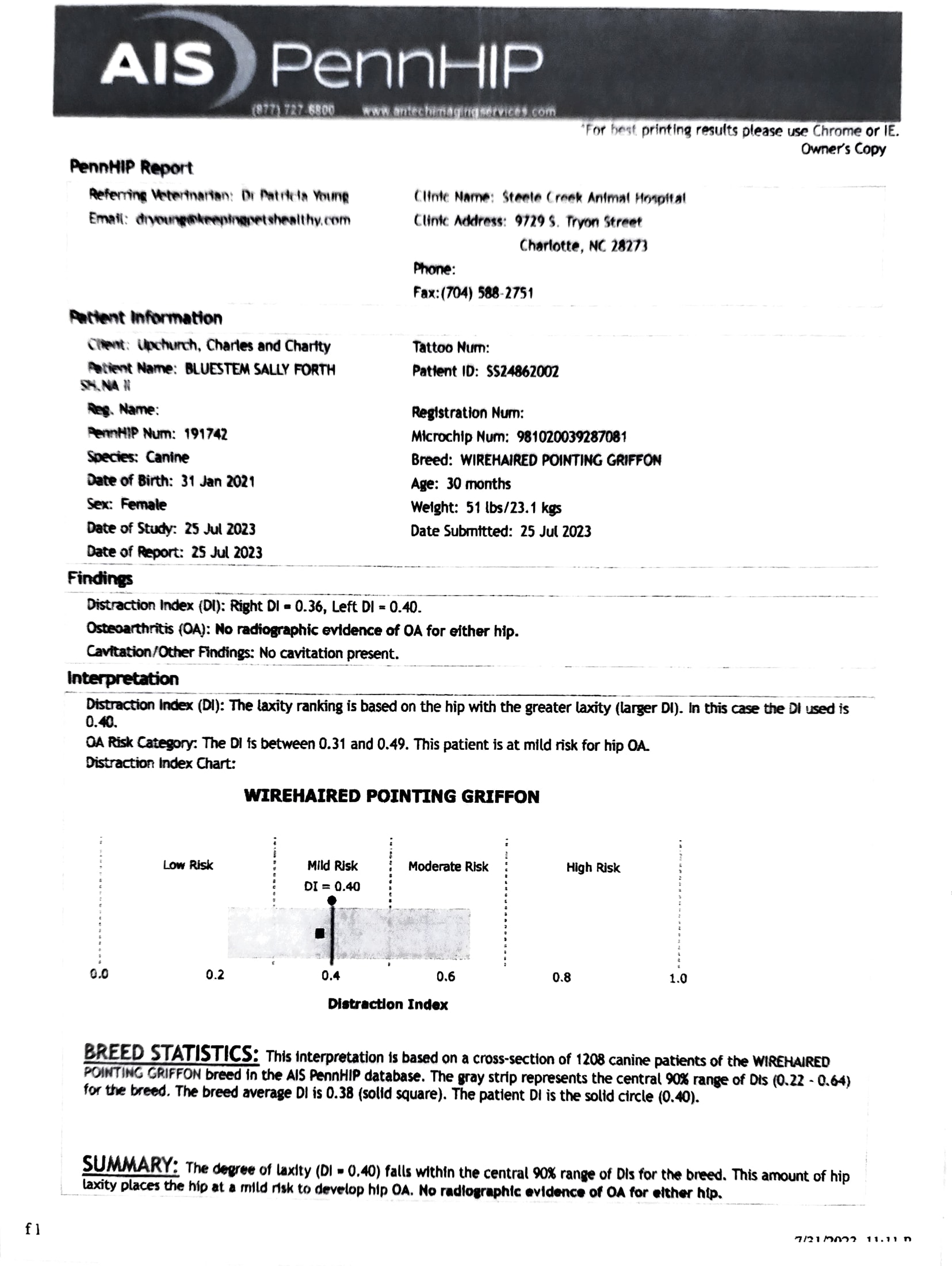 Hips: PennHIP Right DI = .36 Left DI = .4 mild risk for dysplasia (none present), median for the breed