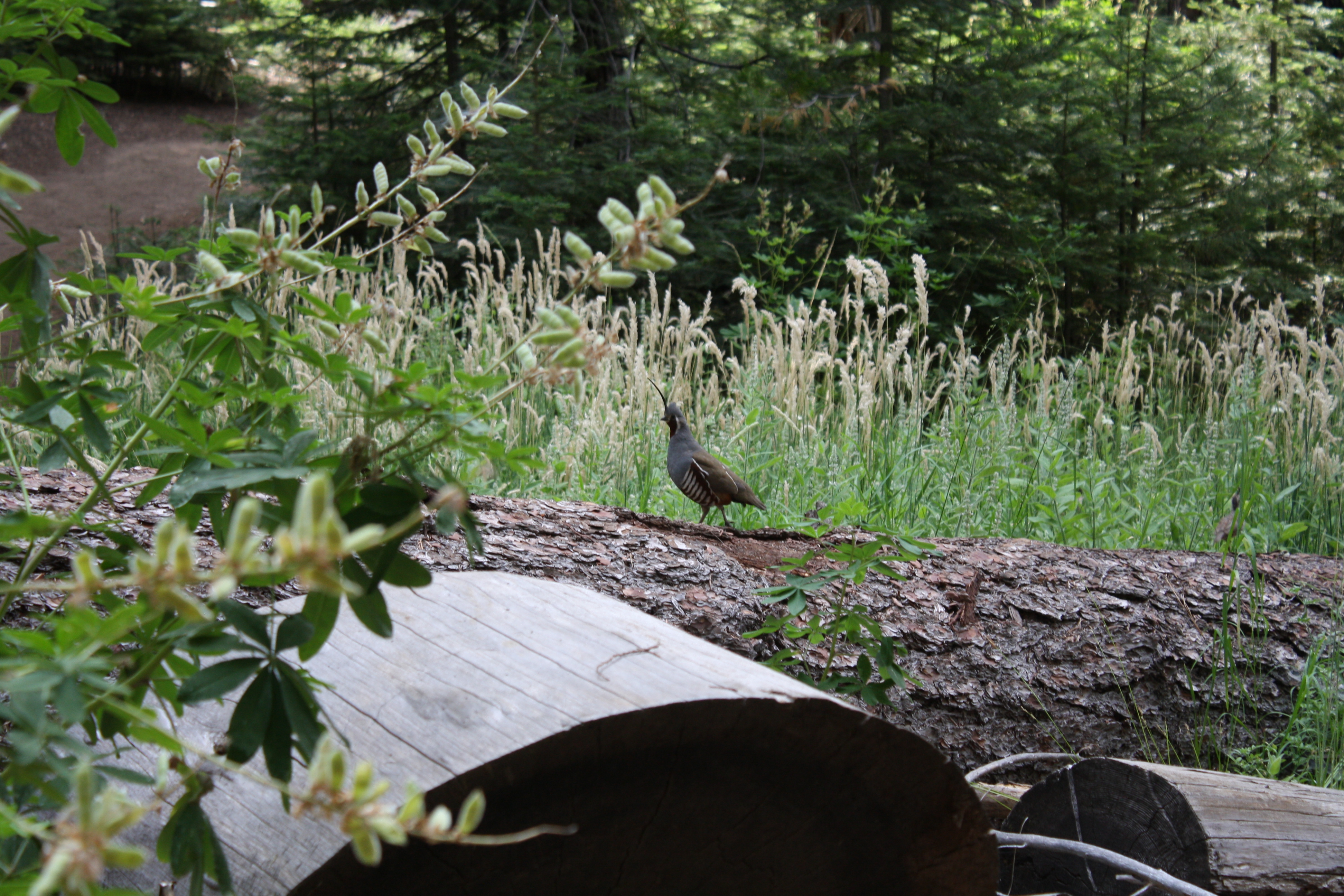 Our first stop was the Mariposa Grove of Giant Sequoias, because if you get there too late, they close the parking lot and you have to take a shuttle in (which we have never done, we just skip it if it is full). What we thought was going to be a nice hike looking at trees took a bird scouting turn, when we stumbled upon a male Mountain Quail tending to his 6-8 chicks. I did not have my telephoto lens on and had left my camera pack in the van, so we are actually this close to them.