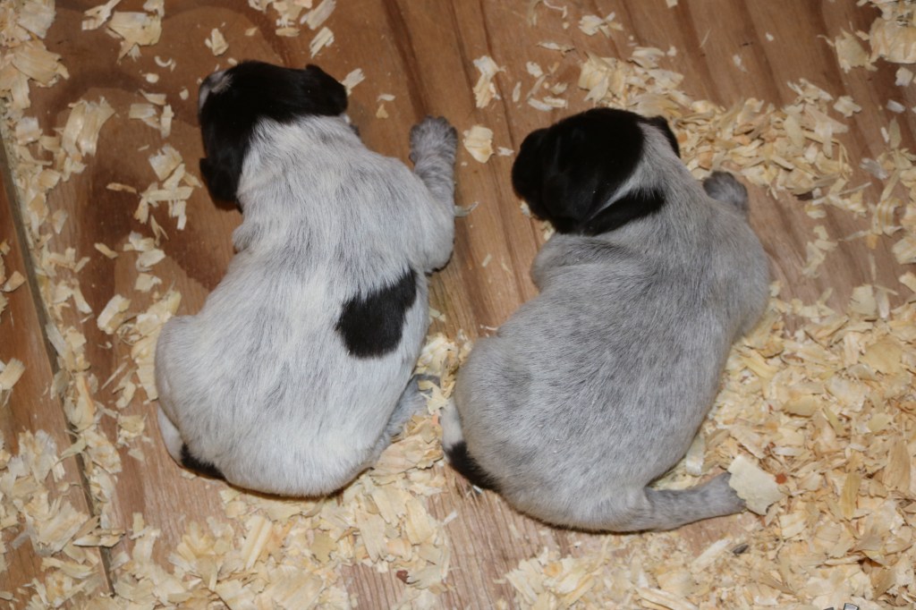 The two girls of the “R” Litter are really growing! Their eyes and ears are open and they are starting to push themselves around the whelping box. They should be up and walking unsteadily by next week and I’ll get them started on some puppy mush, that always gets them up and moving.