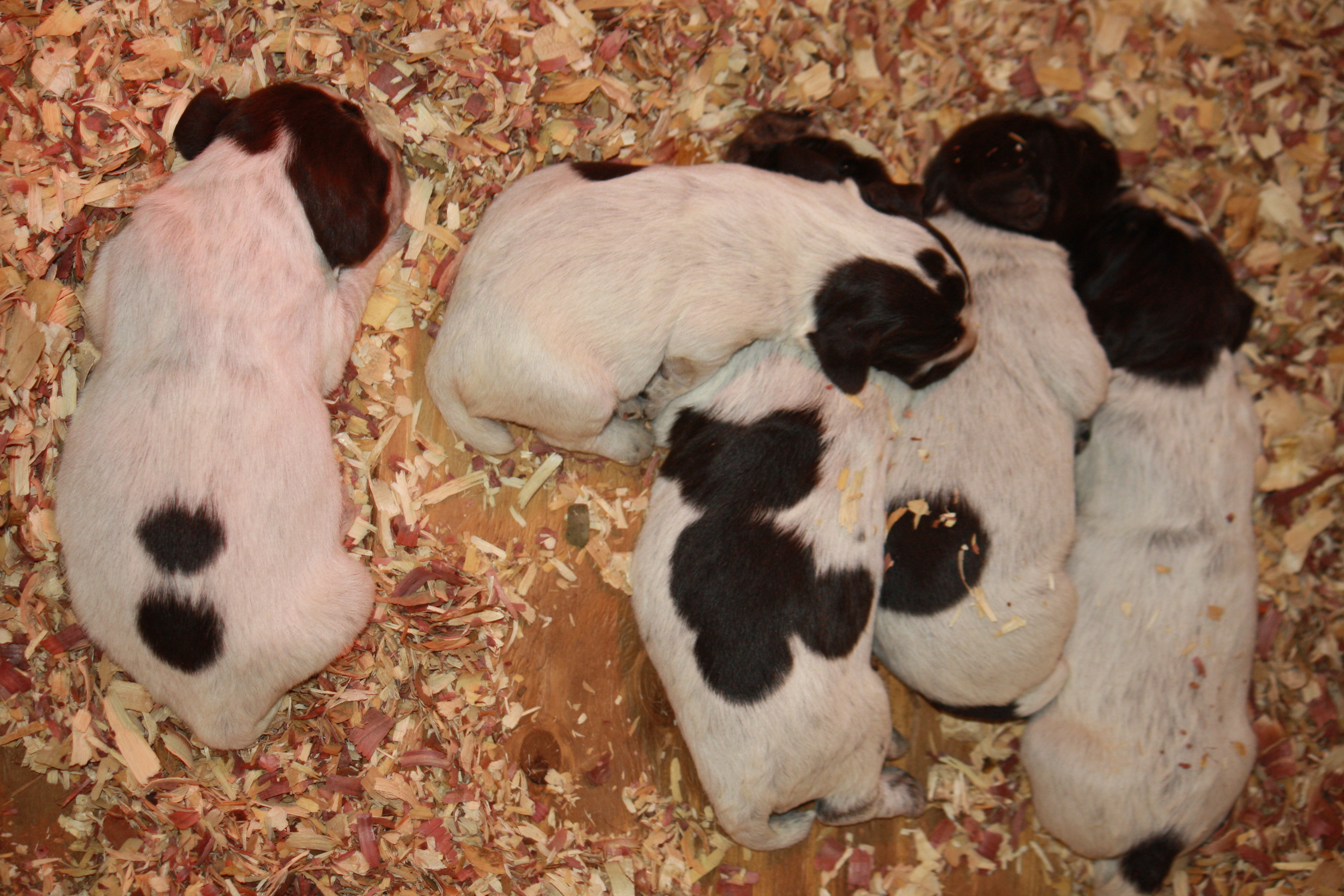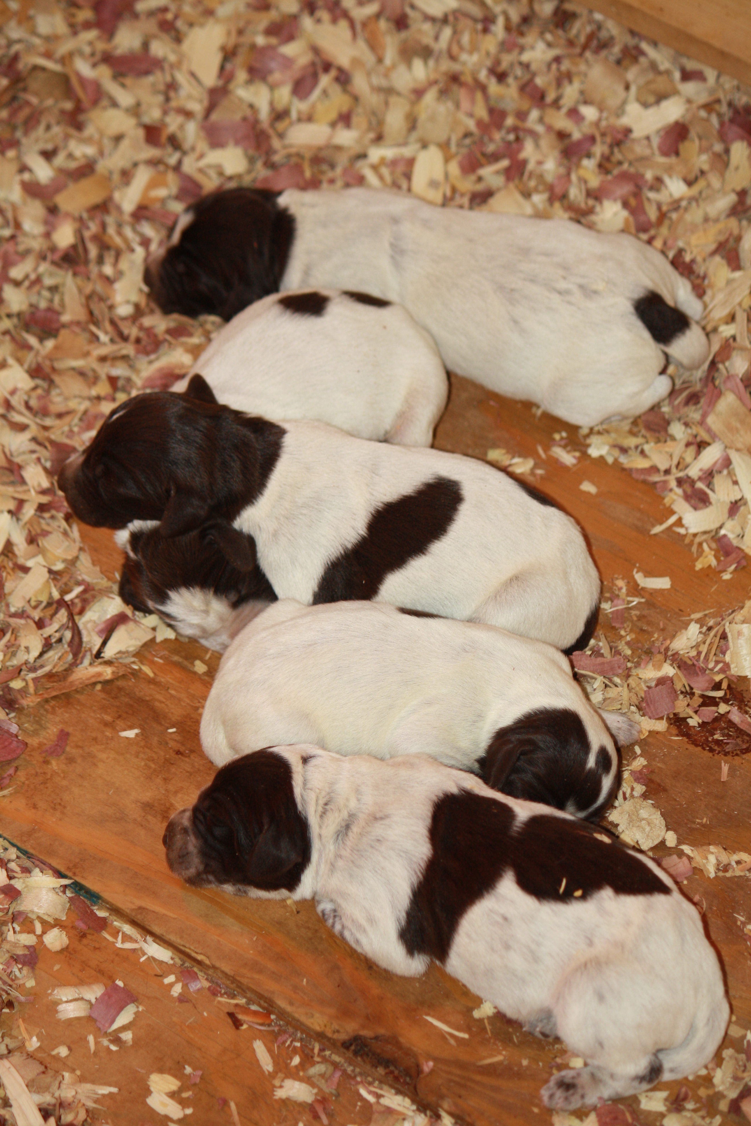 Well, here they are!  I haven’t handled them much, so I can’t yet pick out the boys from the girls.  They had their tails and dew claws done on Wednesday, along with being inspected by the veterinarian.  Everyone checked out so we’ll hope for smooth sailing from here on out!