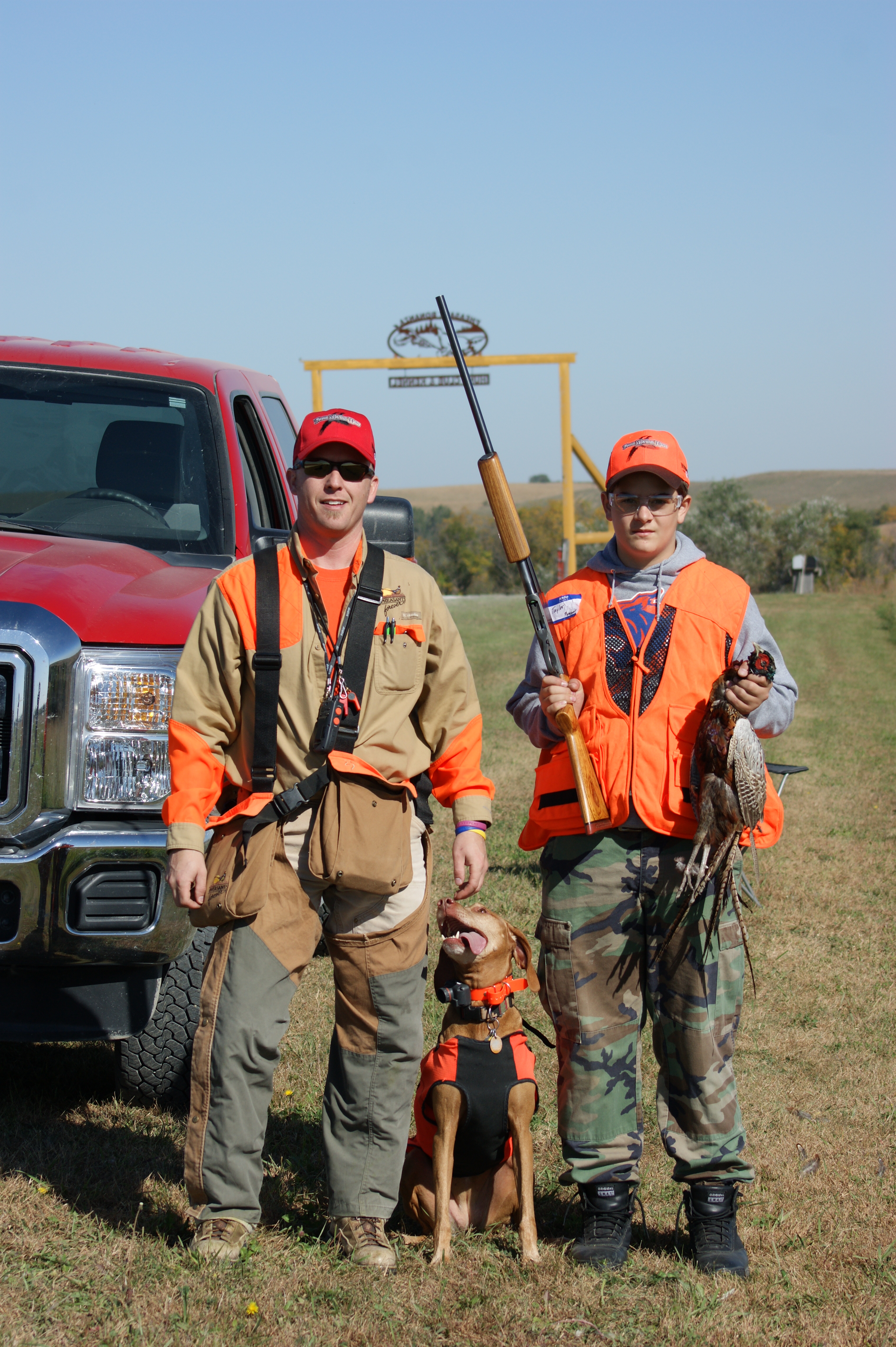 Eleven year old Caleb with his first two pheasants. Obi on retrieve and kiss.