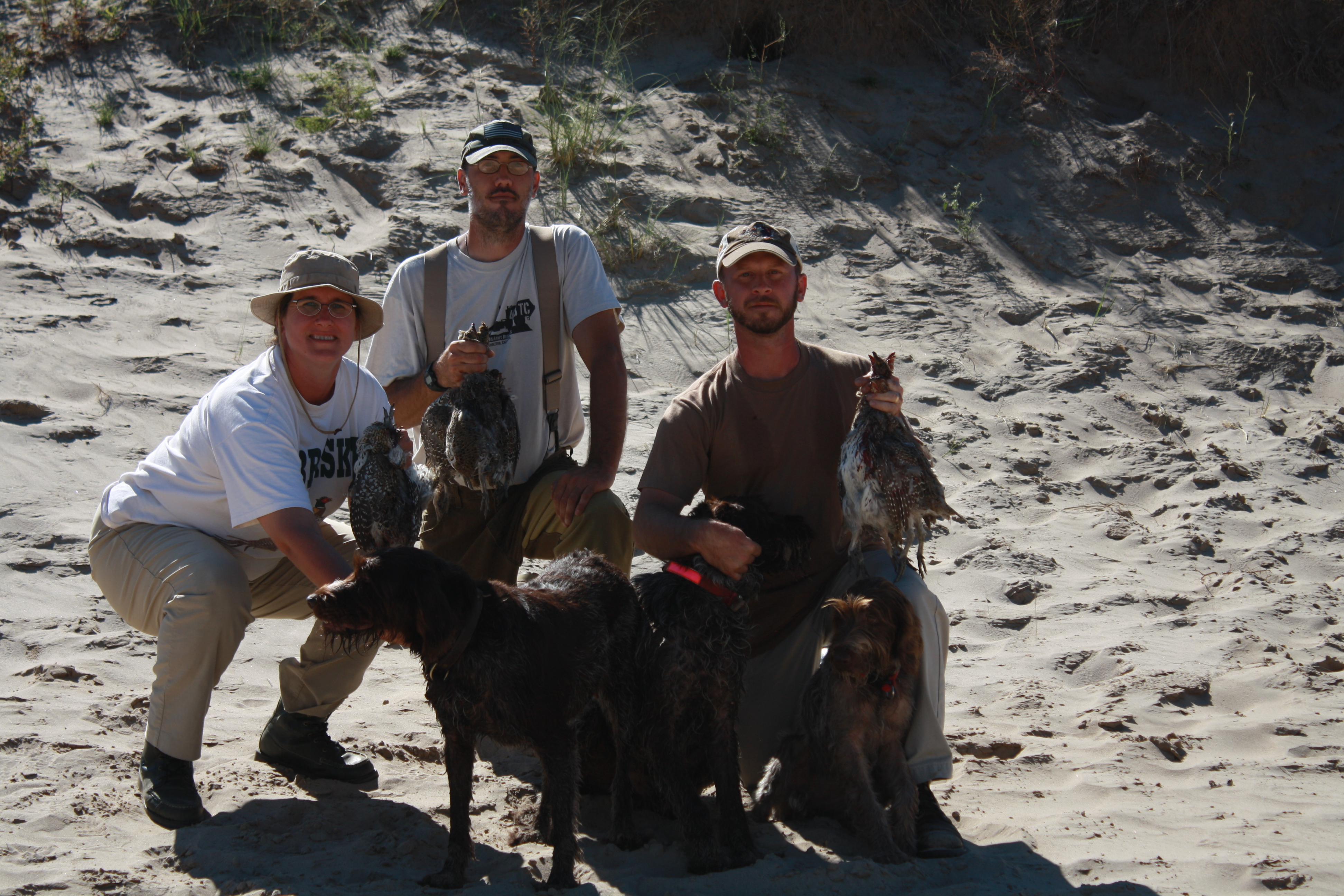 Charity, Ryan and Charles with grouse and doves, Nebraska Sandhills, 09/04/11