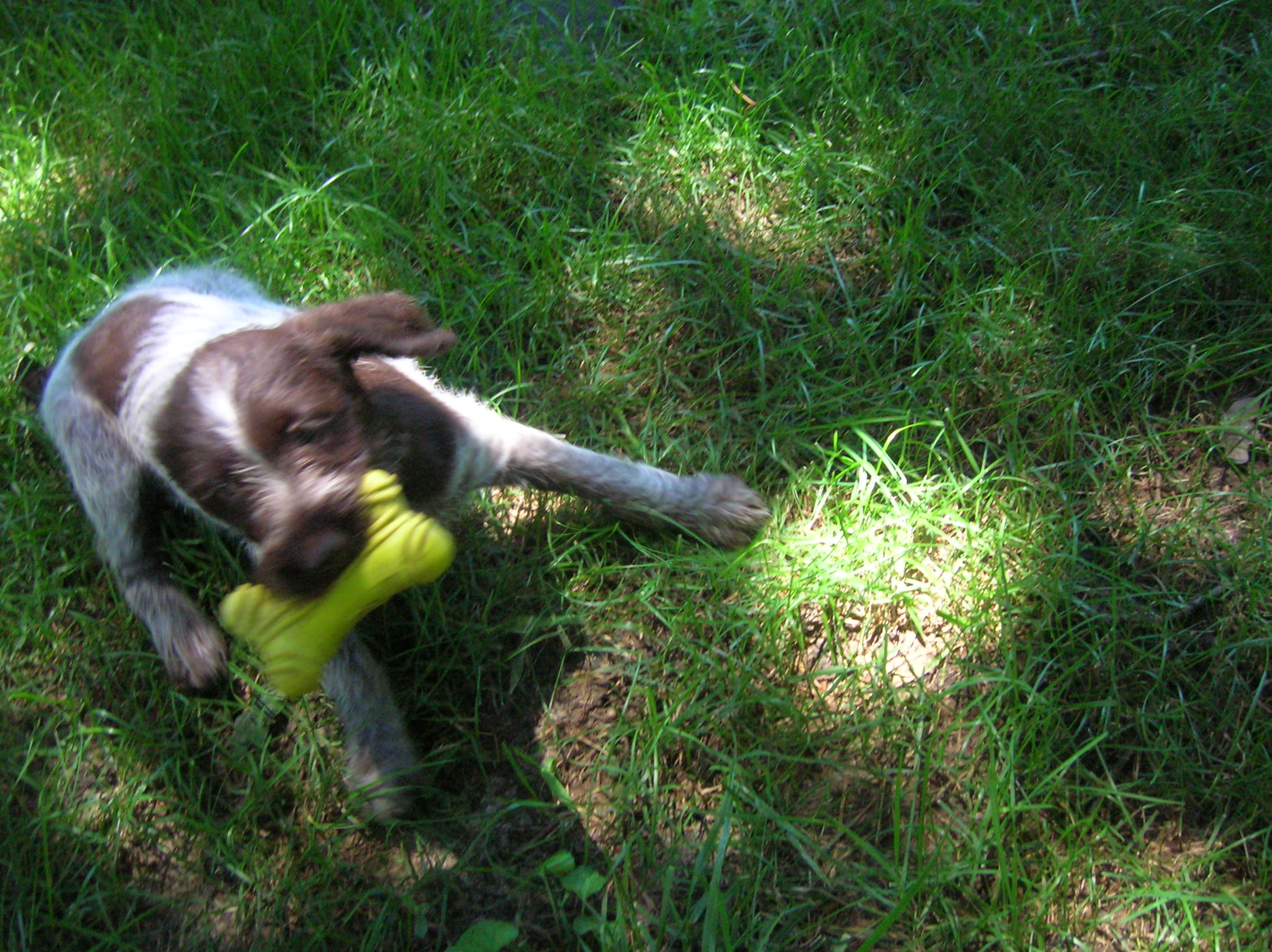 Six week old puppy carrying a bone