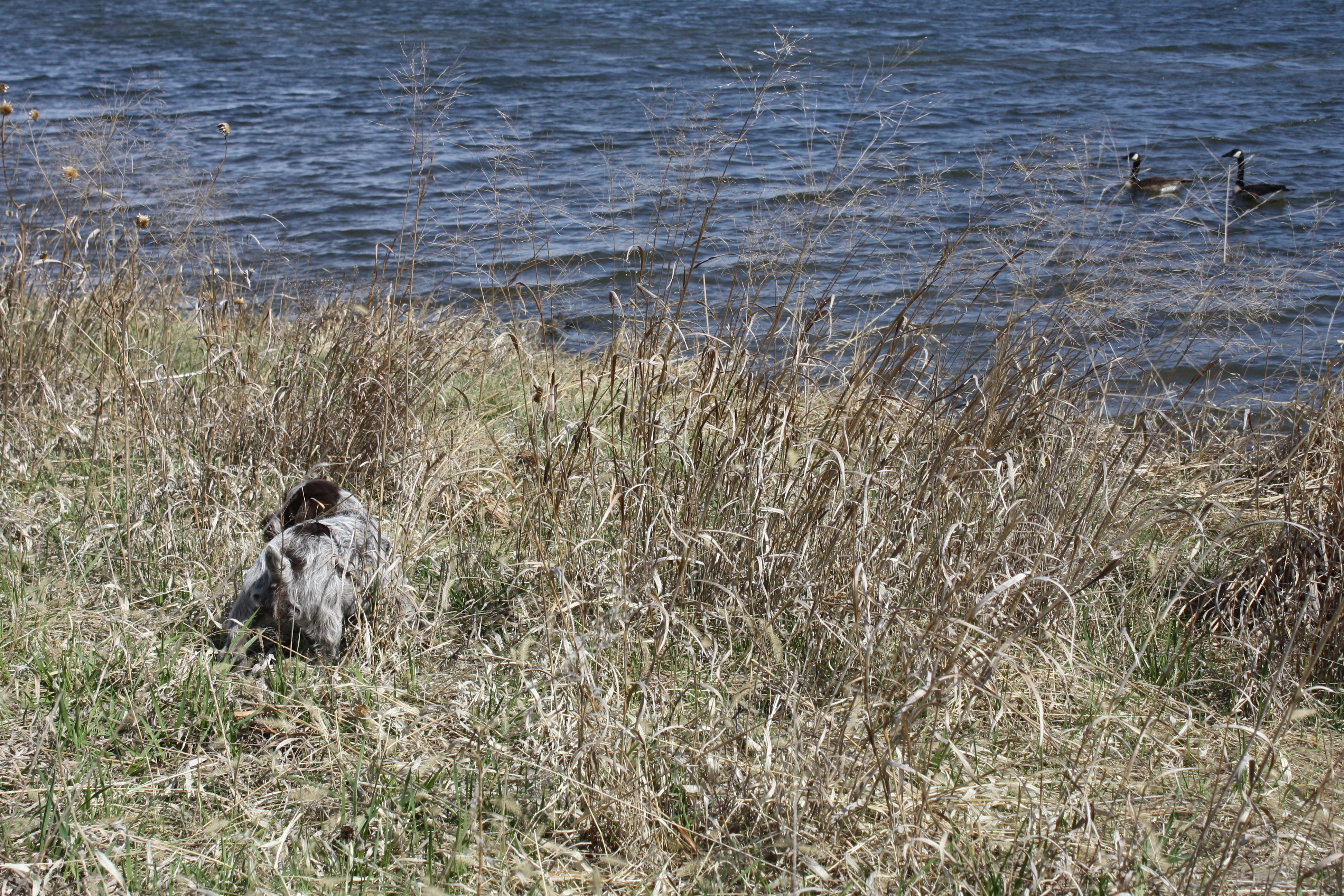Seven week old puppy next to a pond with Canadian Geese
