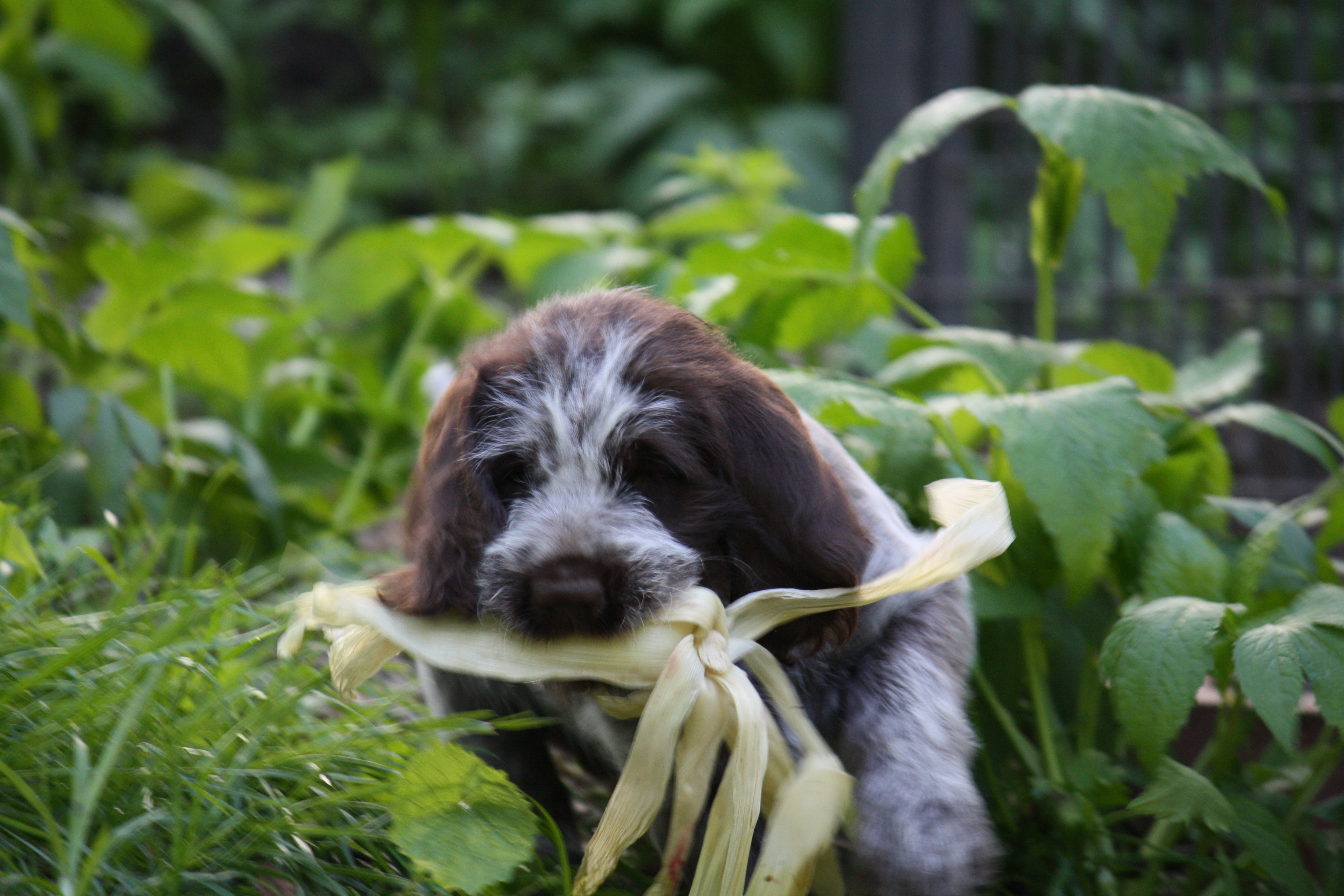 Right now we are mainly working on getting Fire ready to hunt with us this fall. Opening day of sharptailed grouse season is only 2 1/2 months away! She comes when called, searches out in front, retrieves, has a good point, and isn’t afraid of the starter pistol sound. The housebreaking accidents are getting to be more infrequent. I seriously think that griffons are one of the slowest breeds to housebreak and am finding that it usually happens between 16-20 weeks.