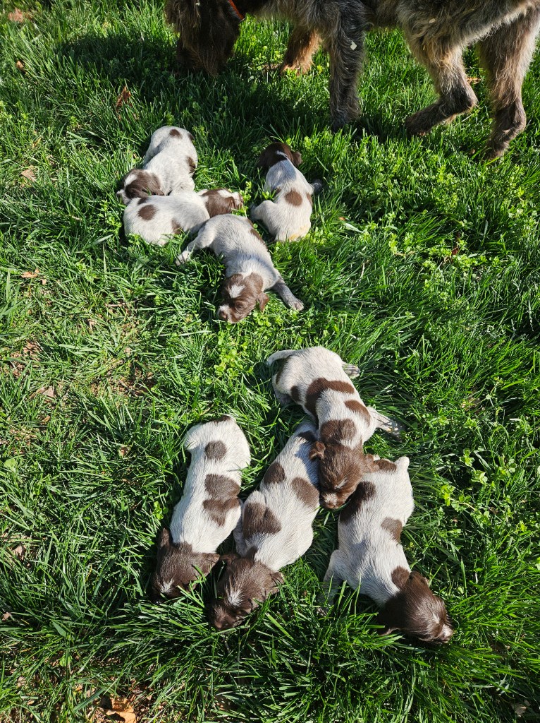 My time with these little ones is coming to a close soon, we go to the veterinarian for final checks, shots and microchips on Thursday, then they start to go home on their eight week birthday on Monday. I’m only doing spring litters at this point, so my next litter won’t be until 2025. Feel free to reach out to bluestemkennels@gmail.com if you are thinking about getting on a list for that time. There are several people who already have deposits down, but things always change with us since the deposits are fully refundable. We pride ourselves in being reputable breeders of Wirehaired Pointing Griffons; you can see the health clearances, hunt titles and pedigrees of our dogs on the “About Our Dogs” page.