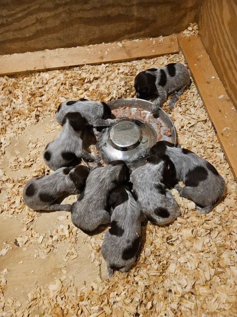 Time is getting shorter and shorter with this bunch. For those of you who check in with my often, you all know that my litters are spoken for well before they are bred. For those of you who are new to my blog and are looking for a puppy in the future, feel free to reach out to me at bluestemkennels@gmail.com. It is taking me a few days to get back with folks since I am so busy with not only these six week old puppies, but I just trained the new editor of the AWPGA magazine the Griffonnier, and I’m working on more preparations for the 2024 National Specialty in North Carolina in November. Whew!!