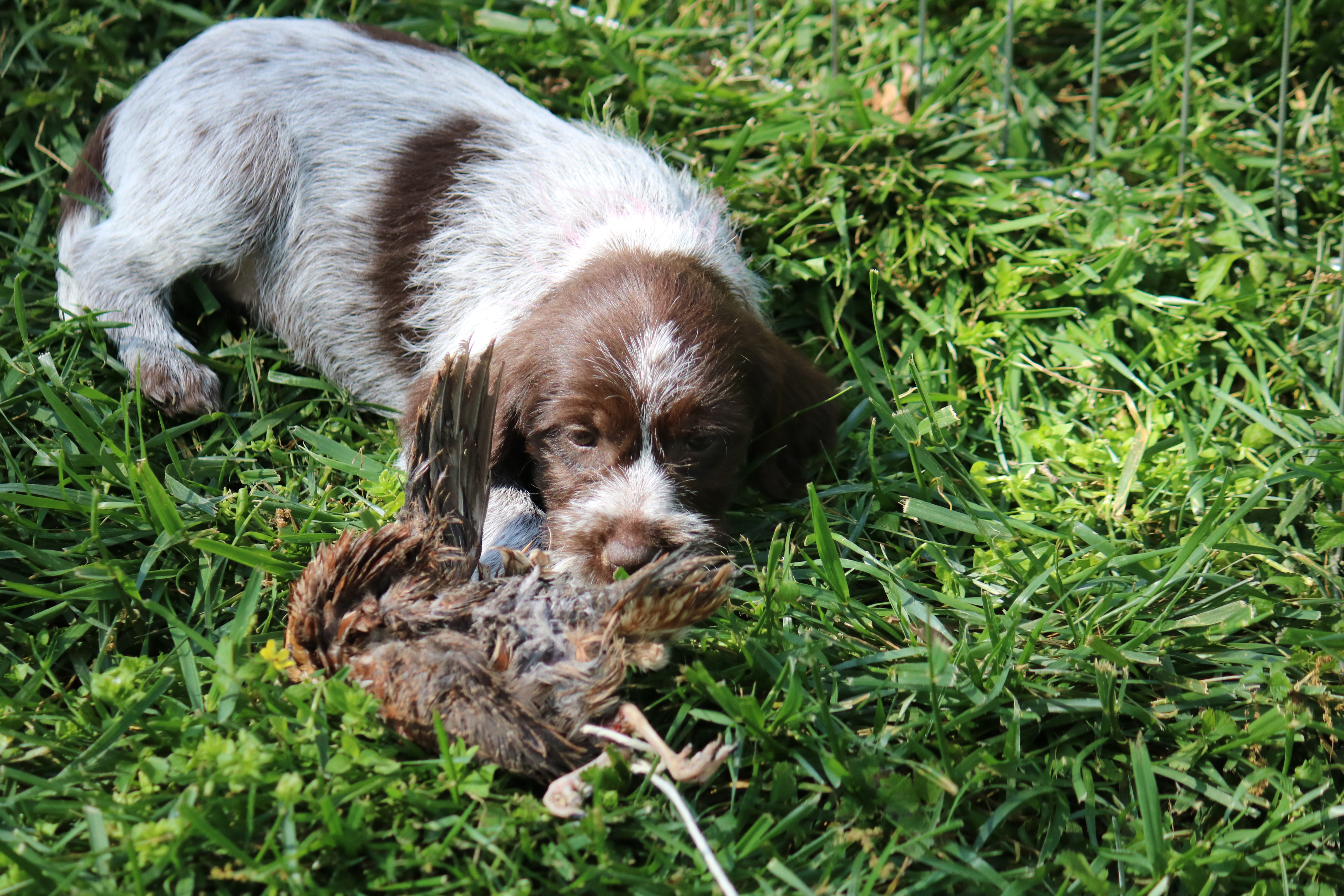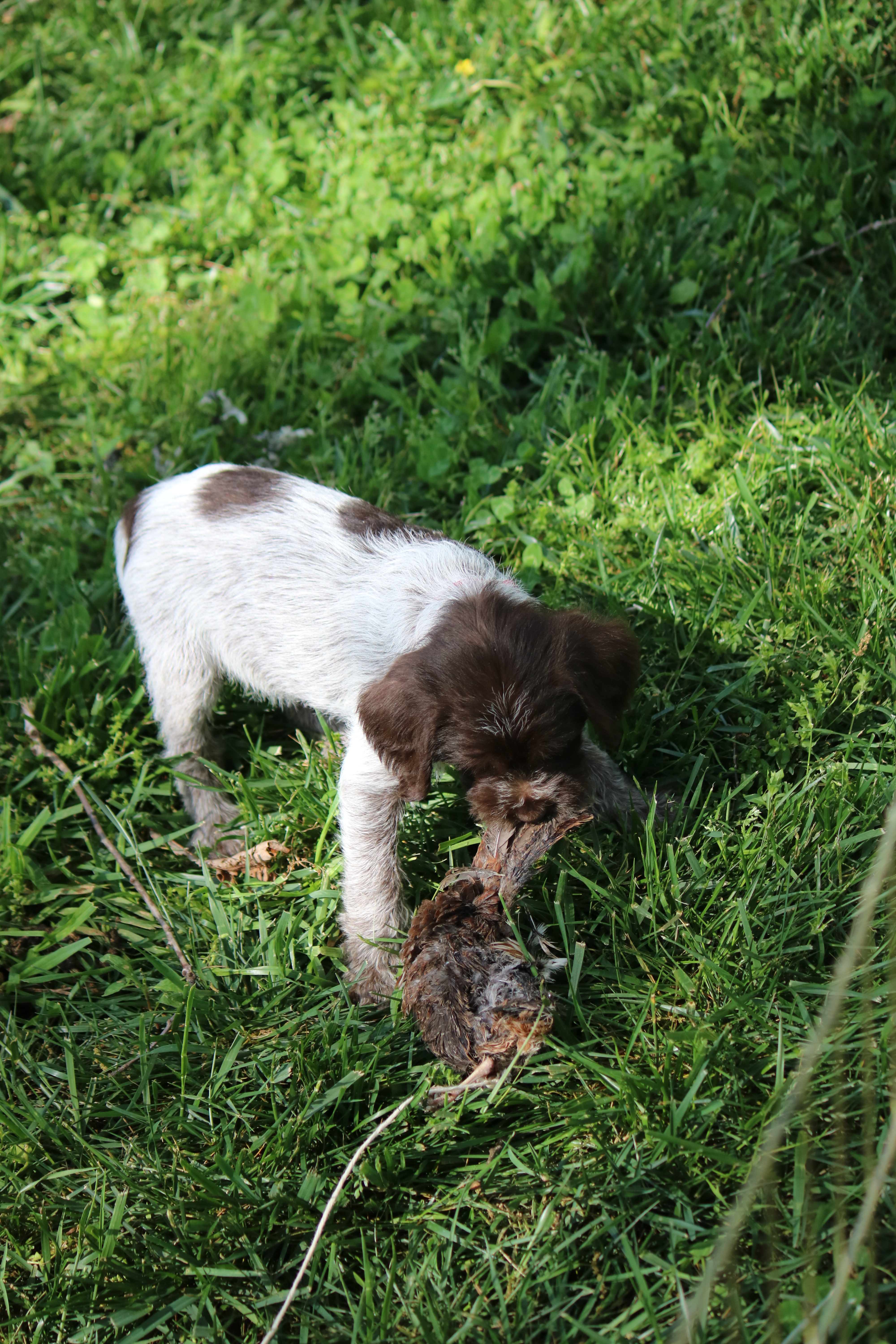 They’ve all done really well with cap gun fire exposure, I call them to meals by banging on a metal bucket with a rod, so loud noises have a positive meaning for them. As long as their new owners focus on working with bird contact excitement while exposing them to things such as starter pistols and eventually shotgun fire, they won’t have problems with gunfire conditioning. I still like Richard Wolters Gun Dog as an easy place to start with puppies in book form. Of course, once your puppy is fully vaccinated you should take him or her to their first NAVHDA training day for advice too! Griffons don’t do very well with being sent away for training since they are so attached to their people, so if you decide to work with a professional, have them work with both you and the dog together.