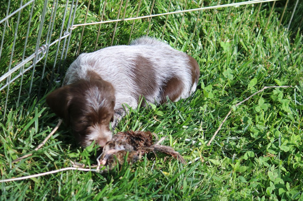 Okay, so here are the photos from the live and dead bird exposure. The set up I use is to take them out of the kennel, walk them to the live chukar in a cage on a leash, after they check out the live bird I pick them up and praise them on the way to the ex-pen where the dead quail on a string sits. I keep the interactions fun, low pressure and positive. I don’t make them pick up the dead quail, I let them just sniff it or pull feathers off if they want to. So these are the last photos of the litter before they go home to their families!
