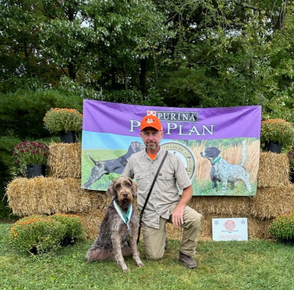 I want to thank my fellow candidate, Kendall DeSanto, for running a clean race with me. As we are longtime friends in the breed, there was no mudslinging involved. You may recognize Kendall from his presentation of the Wirehaired Pointing Griffon breed in past years at the National Dog Show that is televised on Thanksgiving (hosted by the Kennel Club of Philadelphia). Here’s a photo that I took of him showing at the 2014 AWPGA National Specialty in Maine.