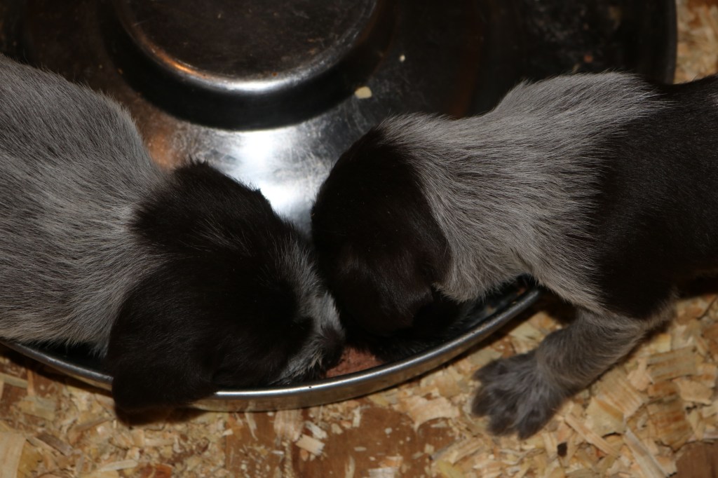 They have just started consistently eating from the dish in the last day or so. Before I was having to encourage them with spoon feeding to bait them into the dish, but now they go for it. They are fed canned puppy food twice a day.