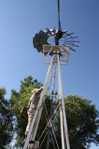 Charles sets up dove decoys on a windmill