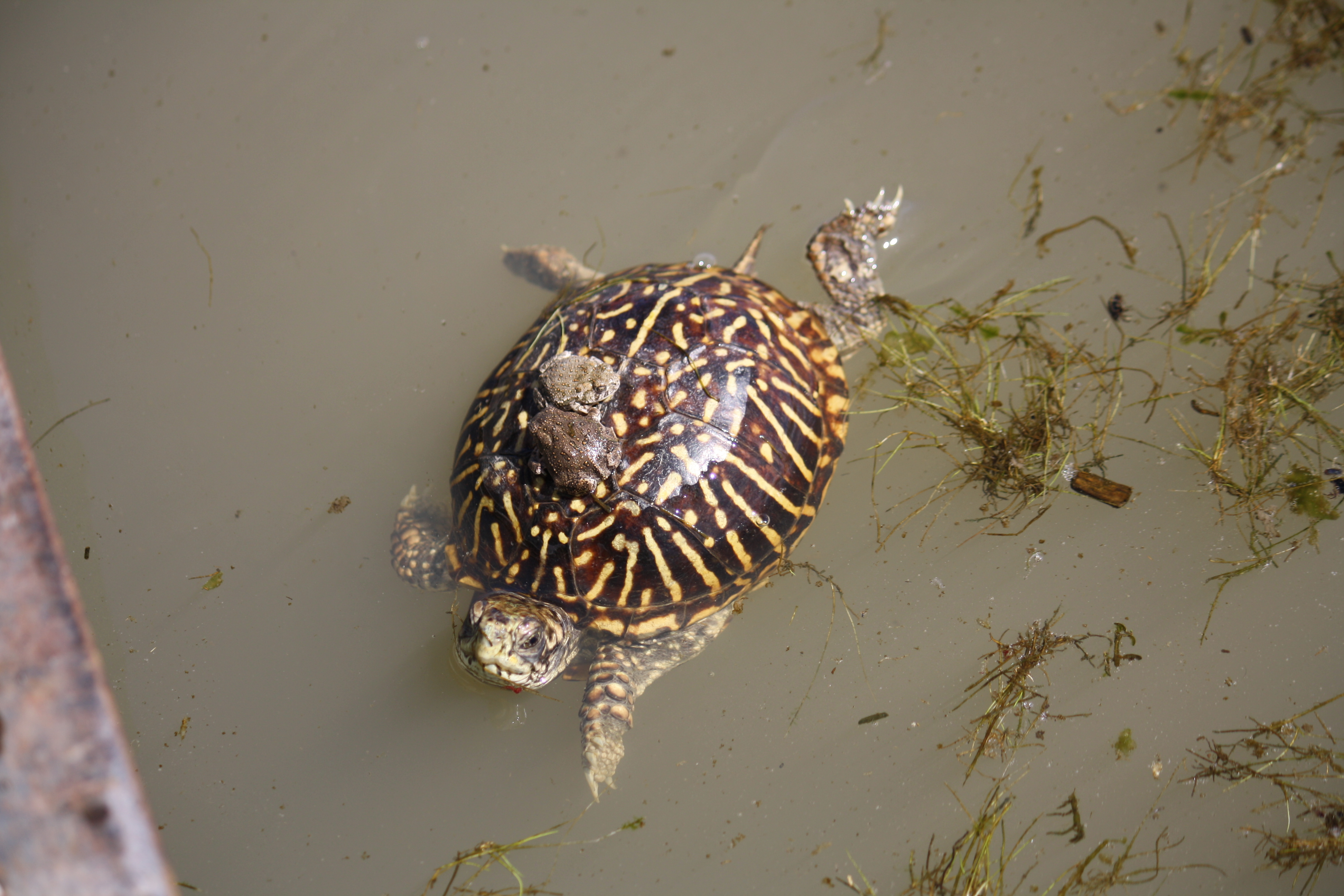Toads in need of rescue hitch a ride on the box turtle's back in a stock tank