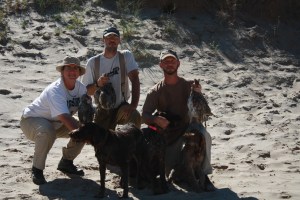 We continued our push across the flat of the valley, up into the northern dunefield, working our way into a break where Charles had taken birds a number of times before. There are often times 100-200 yards between hunters and the dogs typically stay with Charles, so it isn’t unheard of for a hunter to bump into a flock that we have to chase down. As we worked our way back west into the northern dunefield, Ryan flushed up a group of six grouse. I was pretty confident that they had just popped over to the southern side of the hill, so we headed in that direction. Sure enough, we got into the flock again and Ryan nailed a bird. We called in the dogs to retrieve and were very proud when our six month old BB found and marked the bird. She’s still a little wary of having big birds in her mouth, so it wasn’t a retrieve, but finding the bird in the vastness of the Sandhills, before her field-hardened compatriots Sam and Sue, is an accomplishment in and of itself.