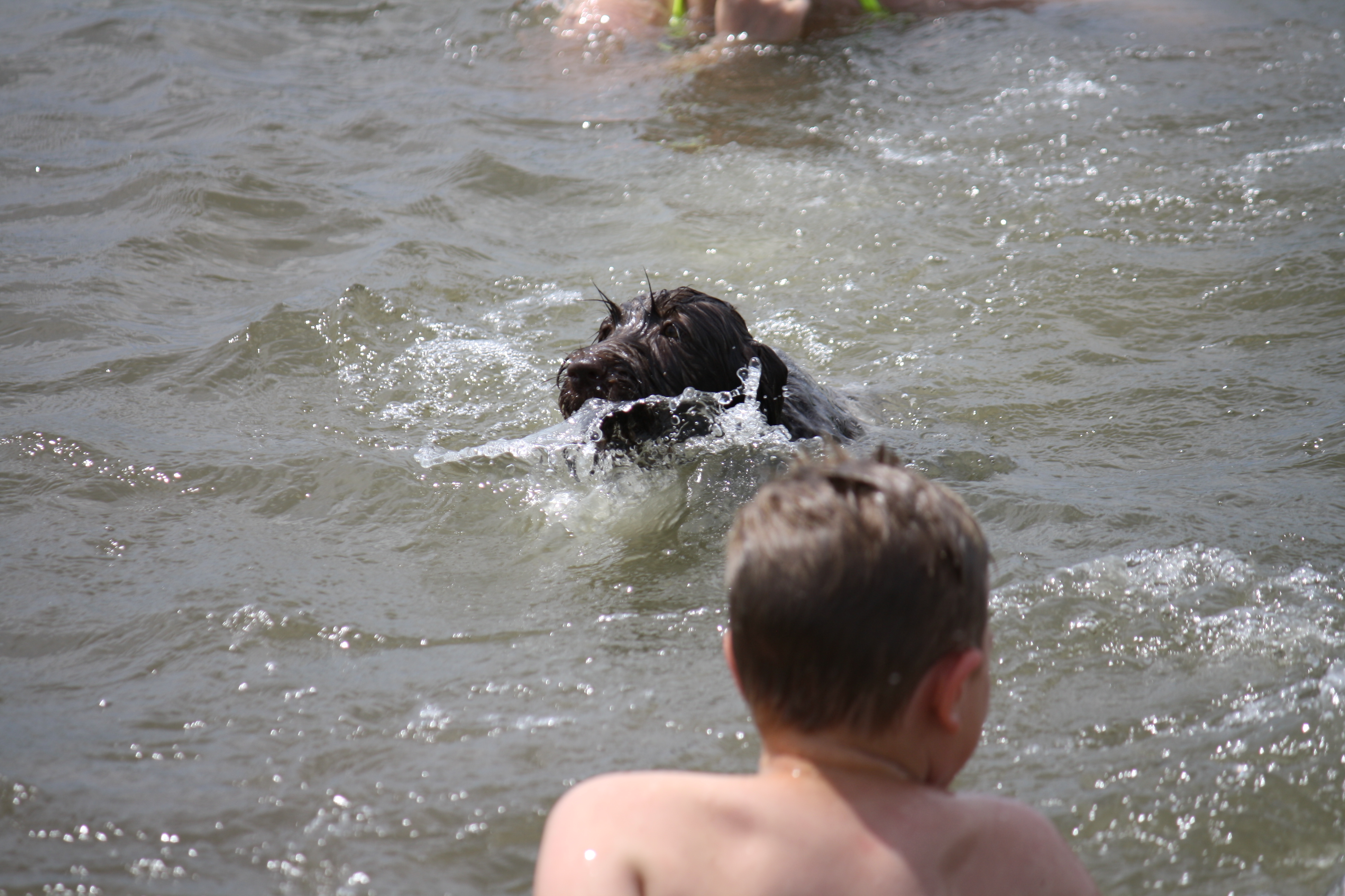 The perspective of the following photo is interesting since it was taken by the person who planted the duck for blind retrieve practice on the bank of the pond opposite Charles as the handler. So Obi was sent from the far side of the pond to swim across and retrieve the duck on the bank that is in the foreground of the picture.