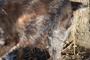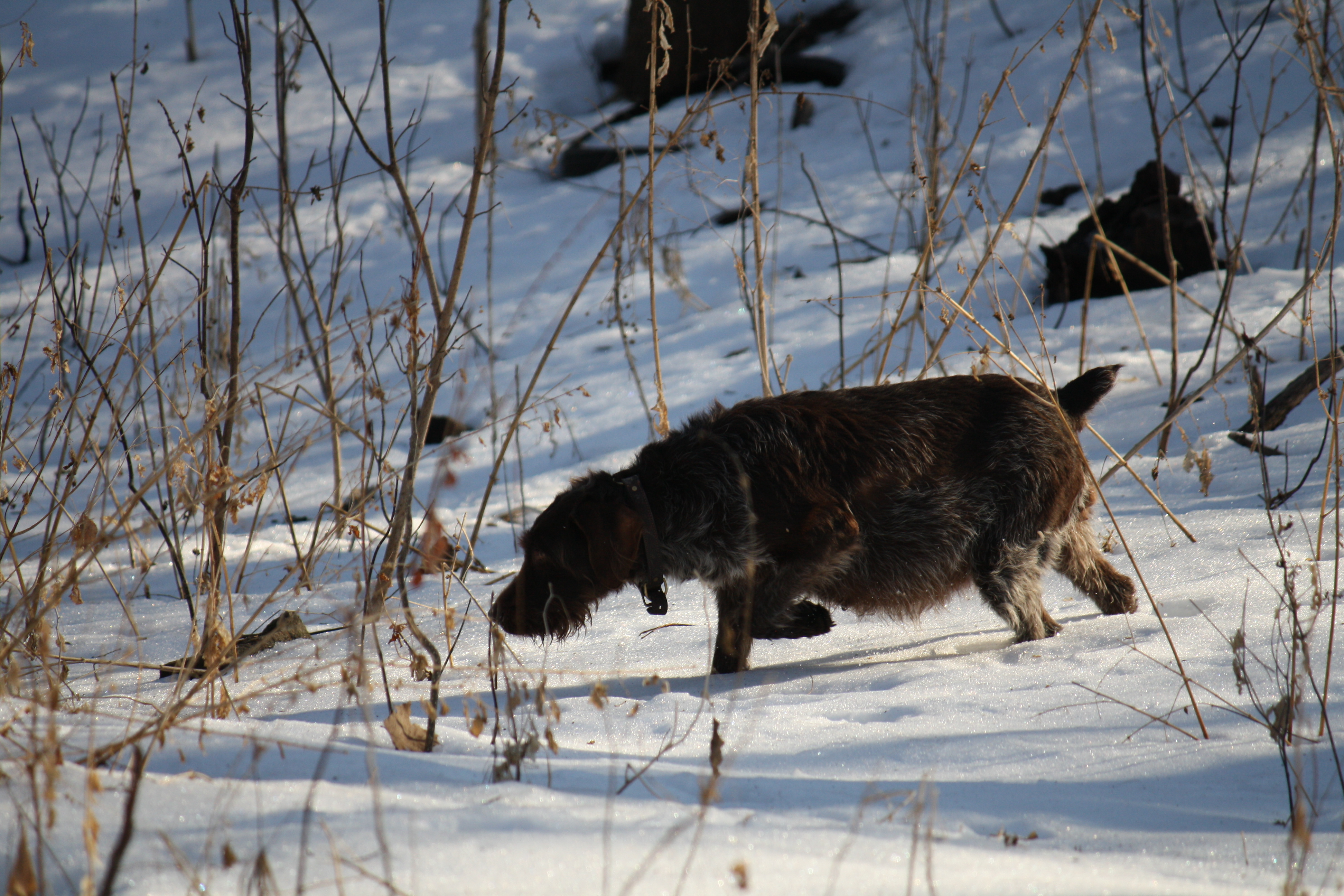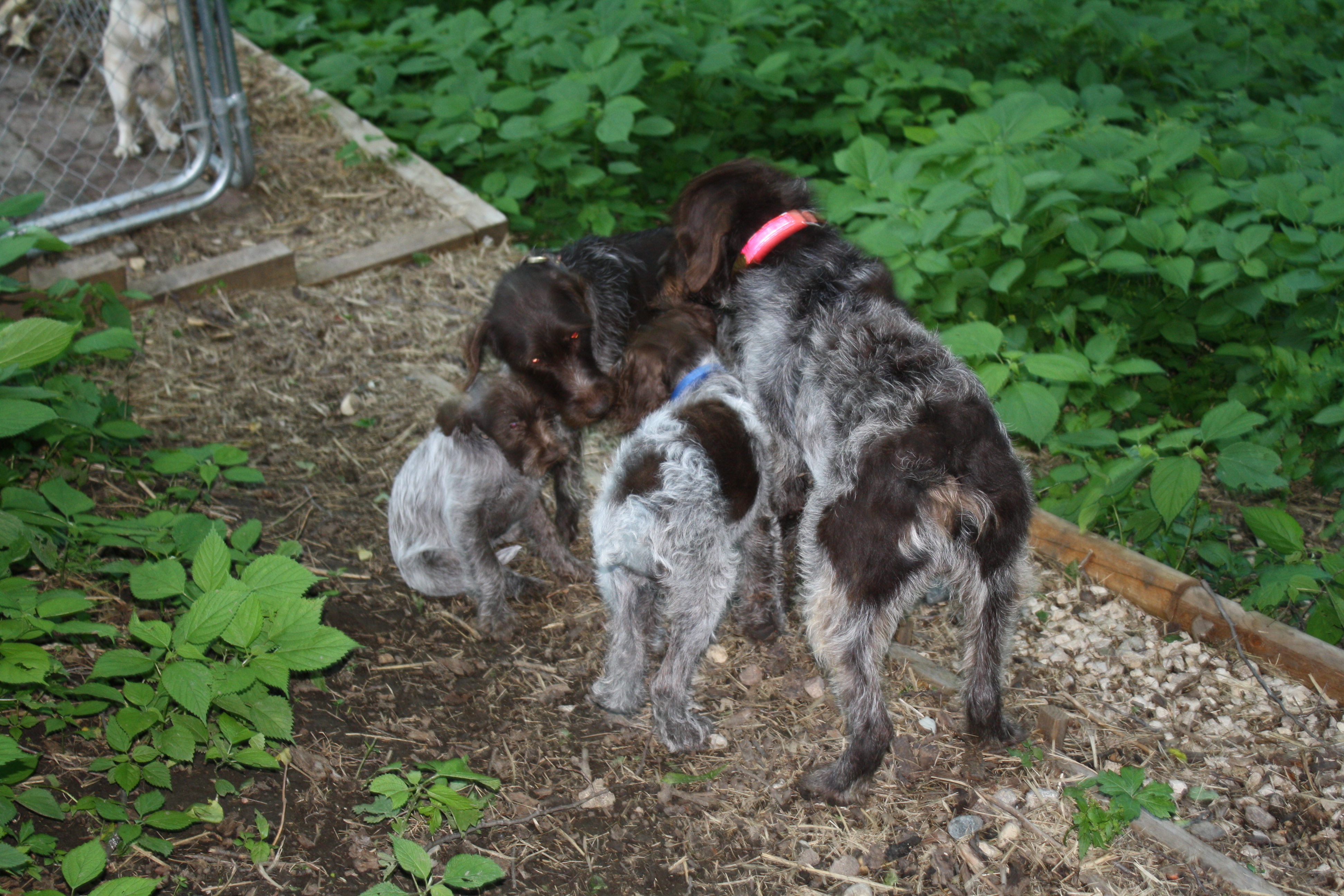 As I was writing this, I received a panicked phone call from a griff owner asking about how to deal with burr mats in the coat. If we run the dogs in burrs, I try to brush them the same or the next day to prevent matting. Should I forget to do this and a mat develops, I try to brush it out with a wide toothed comb or burr puller. I make sure to grab the fur close to the skin before I start yanking on it with the comb. There are spray-on liquid detanglers that you can buy at the pet store to help with this. If it will not come out and the dog is crying and/or trying to grab your hand with its mouth, it is okay to cut the mat out with scissors if you have to.
